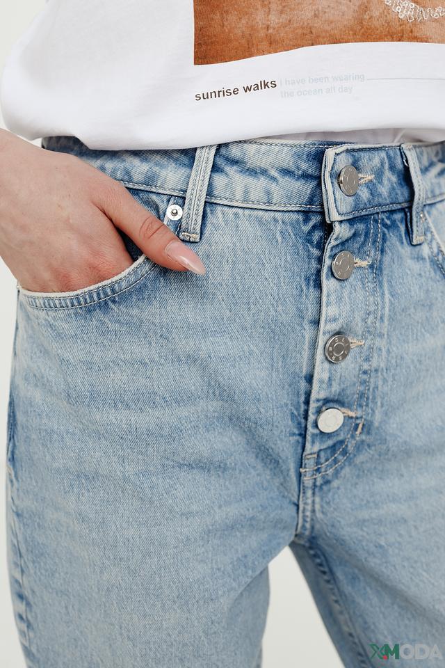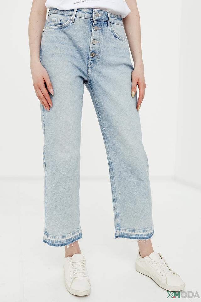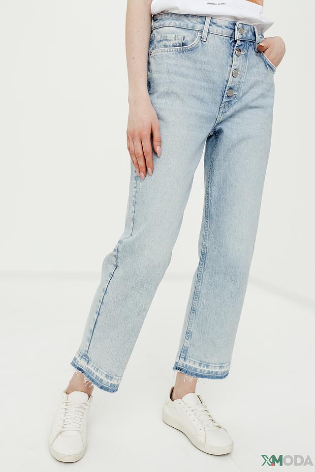 Модель имеет высокую посадку, которая подчеркивает талию и визуально удлиняет ноги. Широкие штанины обеспечивают комфорт и свободу движений. Джинсы застегиваются на пуговицы, что добавляет им оригинальности.