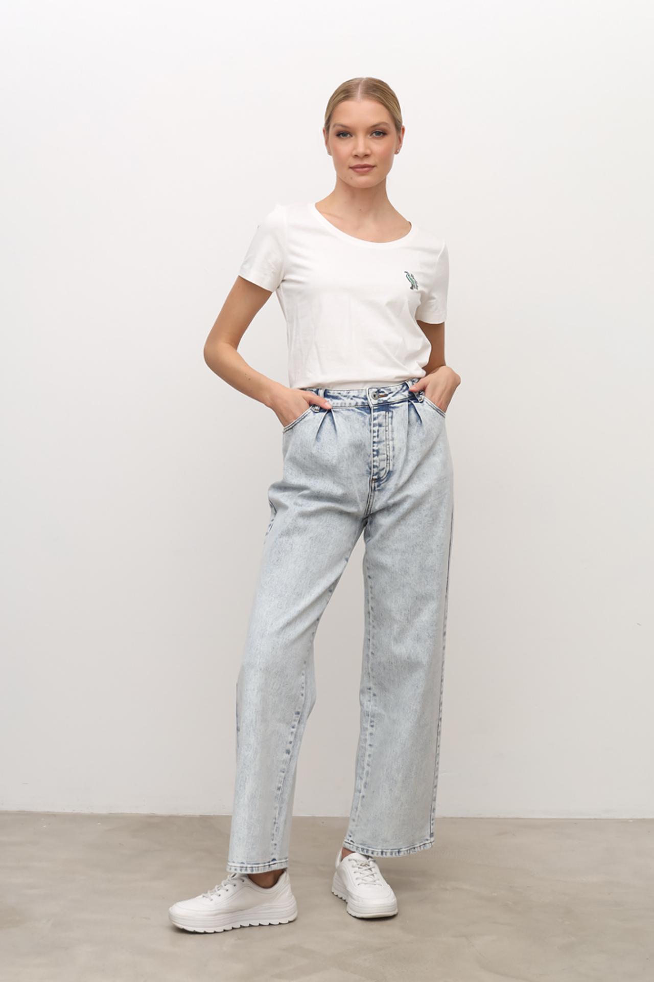 - Комфортный крой: Прямые женские джинсы с высокой талией обеспечивают свободу движений, а защипы на поясе добавляют объем и комфортную посадку, делая силуэт более выразительным.