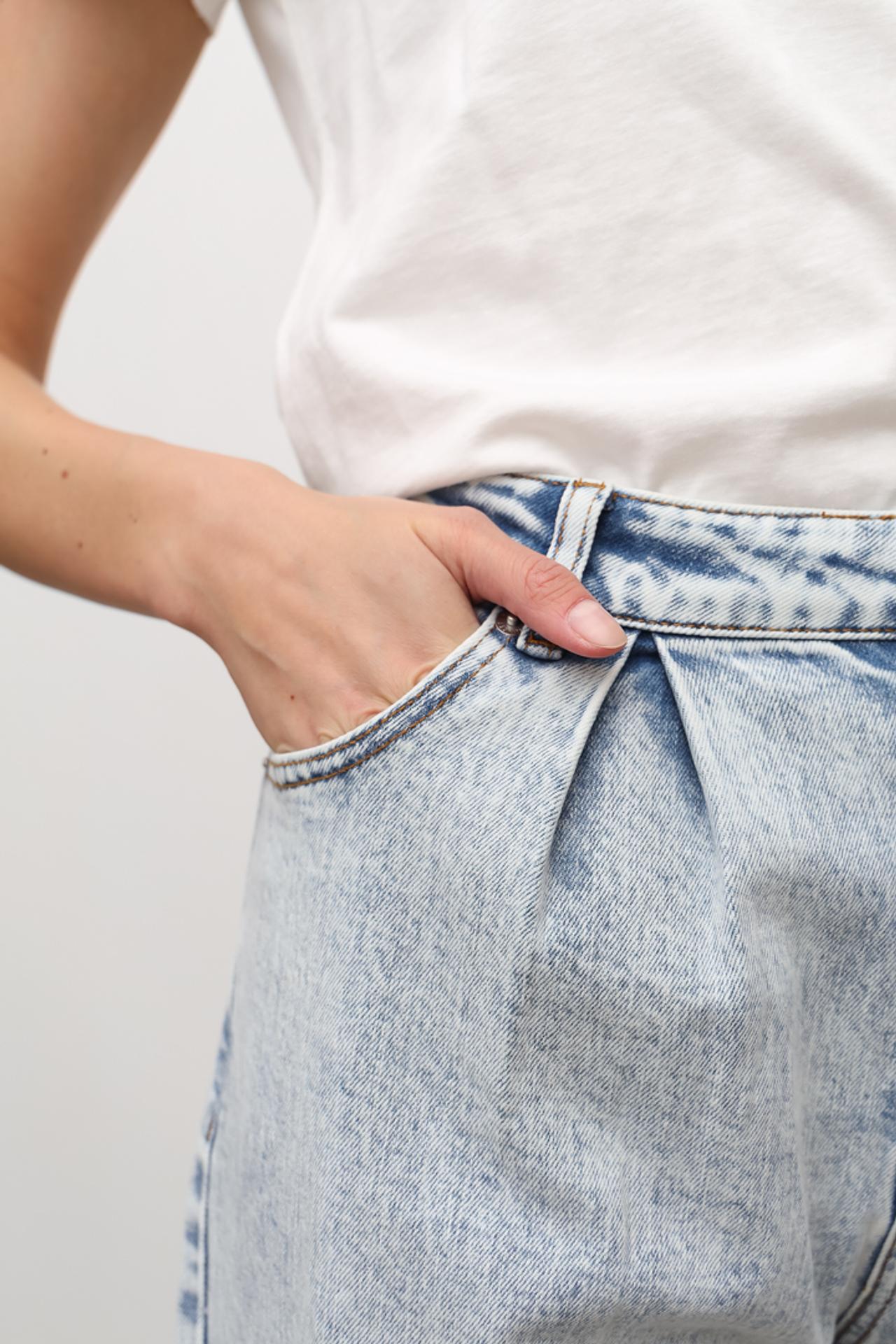 - Актуальный дизайн: Эффект acid wash на светлом дениме создает уникальный винтажный образ, который легко интегрируется как в кэжуал, так и в более стильные ансамбли.
