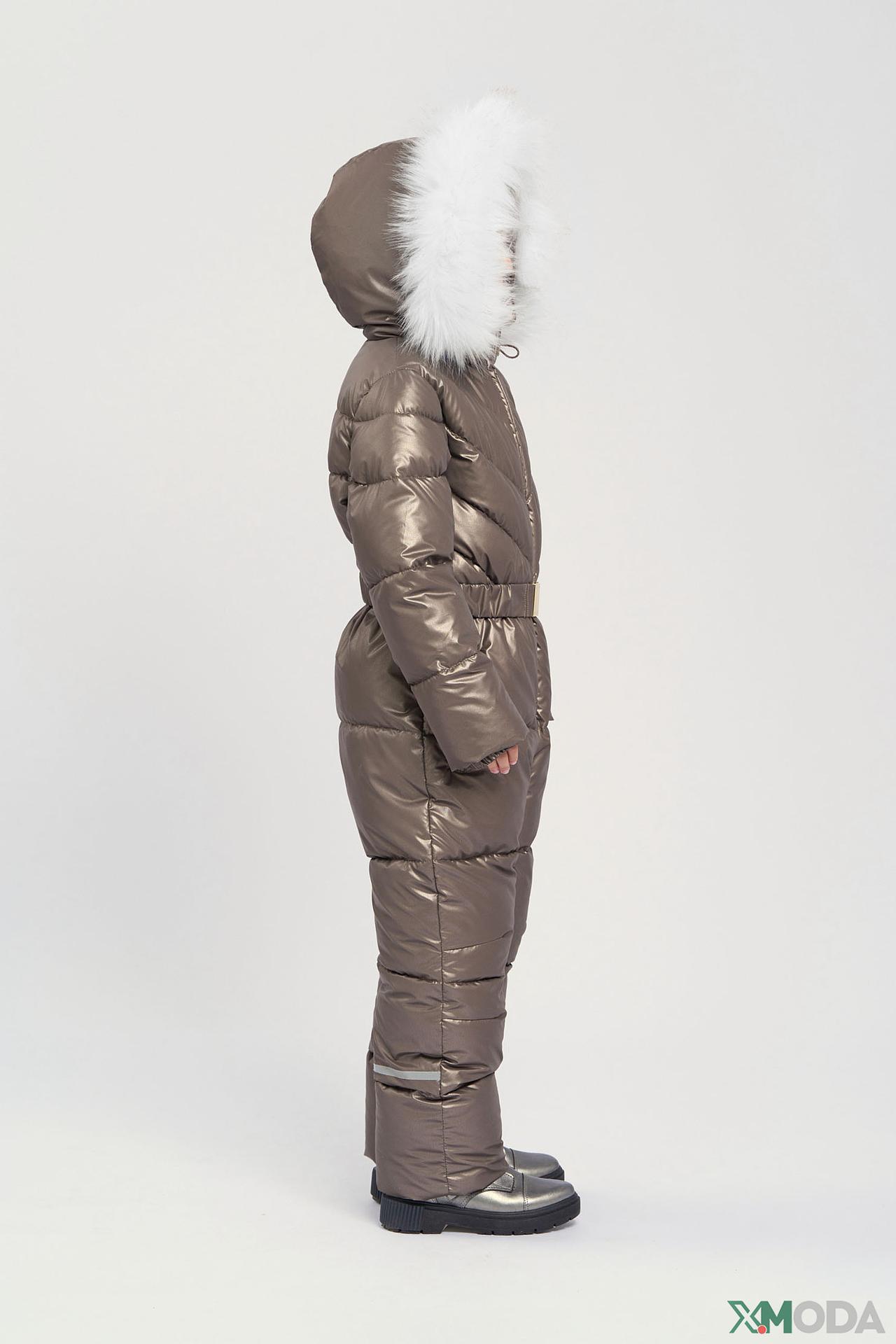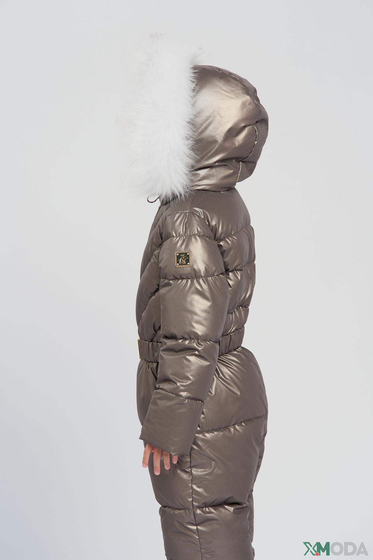 - Элегантный дизайн и комфорт: Модель имеет приталенный силуэт благодаря эластичному поясу с металлической пряжкой, который подчеркивает фигуру и обеспечивает дополнительное прилегание. Горизонтальная простежка по всей длине комбинезона добавляет объема и современного вида, а капюшон с пышным белым мехом придает изделию изысканность.
