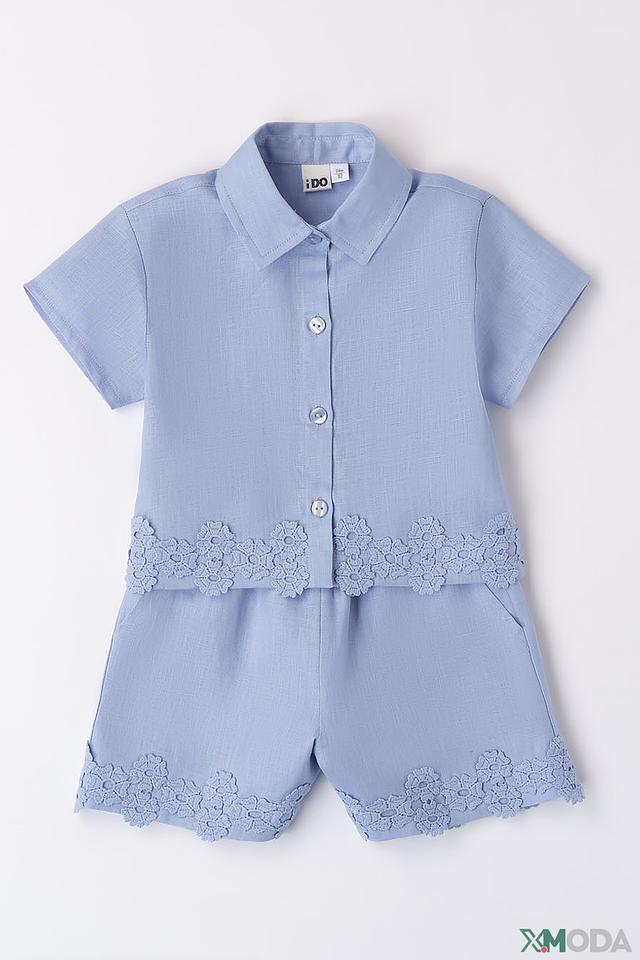 Представляем стильный комплект для девочки от бренда Ido. Комплект состоит из блузки и шорт нежного голубого цвета.