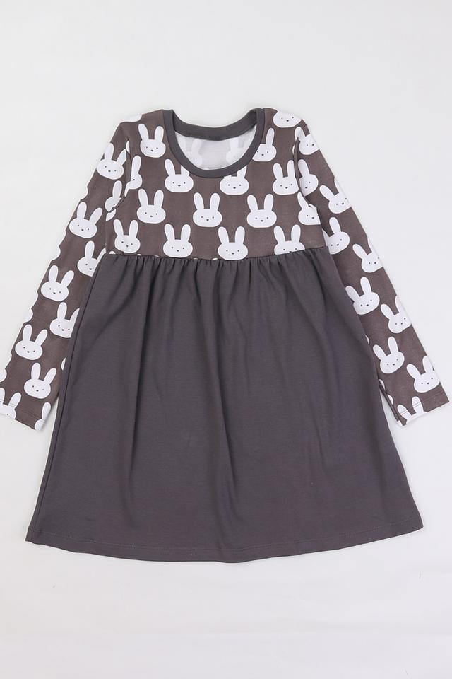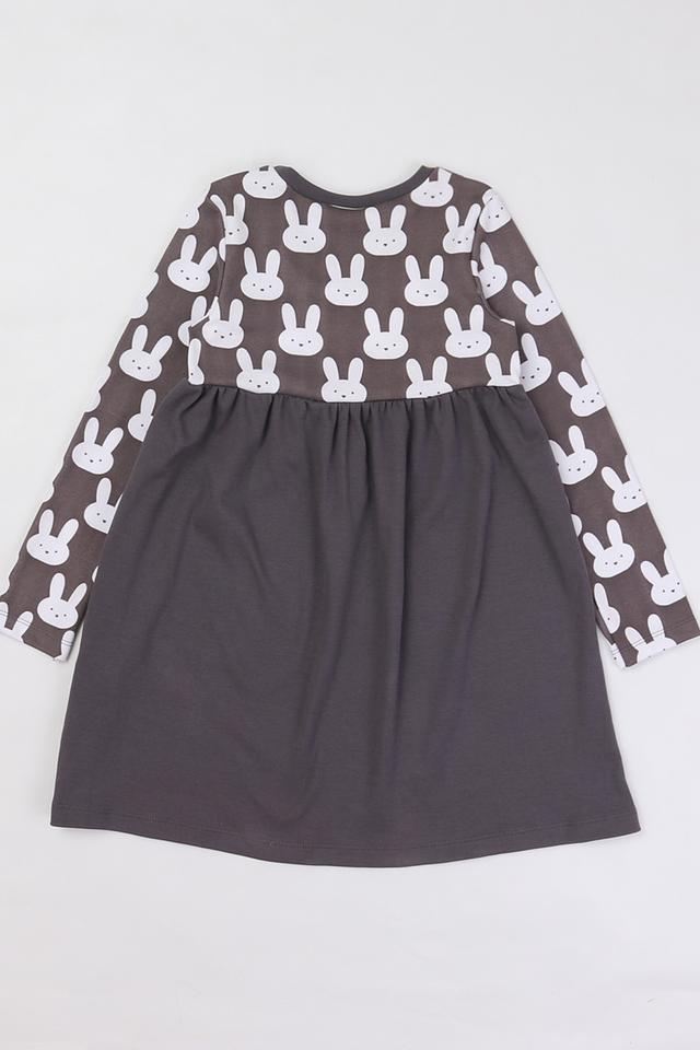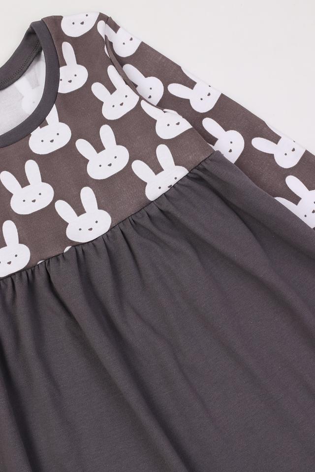 Платье КотМарКот – это стильная и удобная одежда для девочек. Данная модель выполнена в сером цвете и украшена очаровательным принтом с белыми зайчиками.