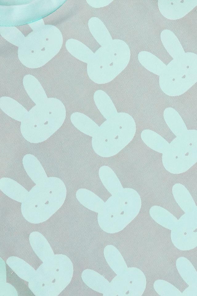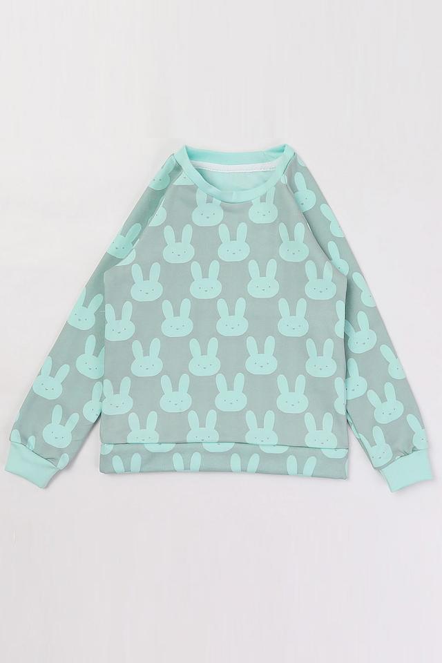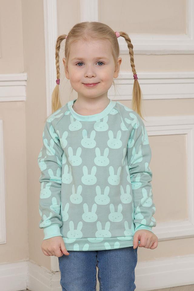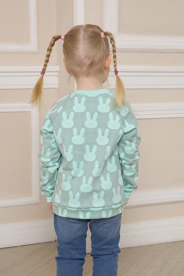 Джемпер имеет мятный цвет и украшен забавным принтом с изображением белых зайчиков. Округлый вырез горловины и длинные рукава обеспечивают комфортную посадку. Мягкая ткань не сковывает движения, позволяя ребёнку свободно играть и заниматься своими делами.