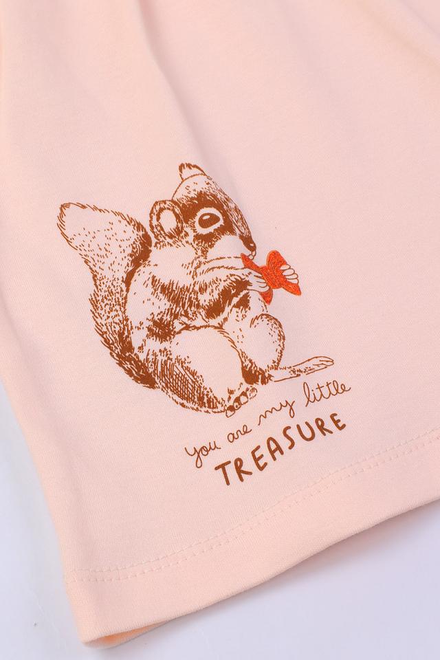Джемпер имеет длинный рукав и высокий воротник-стойку, который защитит шею от холода. Передняя часть украшена забавным принтом с изображением бельчонка и надписью “You are my little TREASURE”.