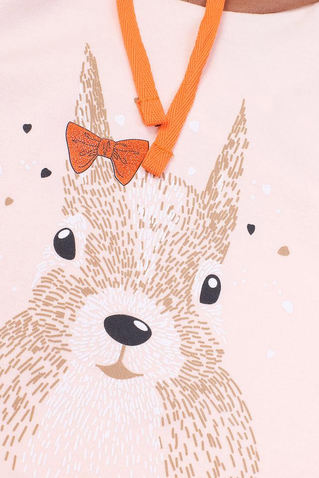 Основной элемент дизайна – яркий принт оленя с бантиком, выполненный в золотистых тонах на светло-розовом фоне. Капюшон дополнен завязками оранжевого цвета, что придает модели игривый вид.