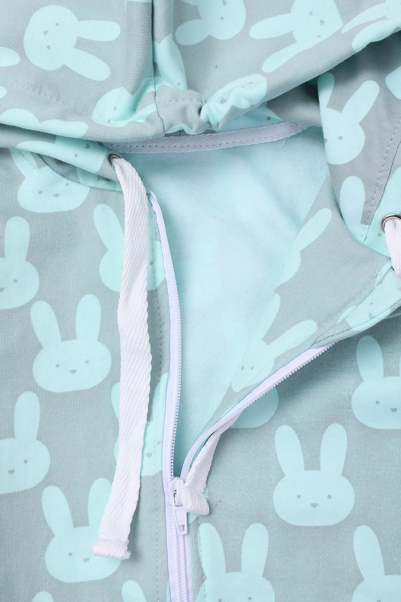 - Яркий дизайн: Свежий мятный оттенок и очаровательный принт с изображением зайчиков делают этот детский худи по-настоящему игривым и стильным.