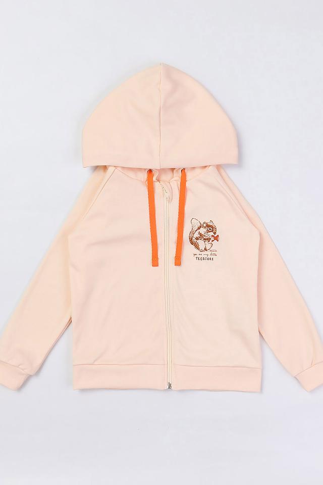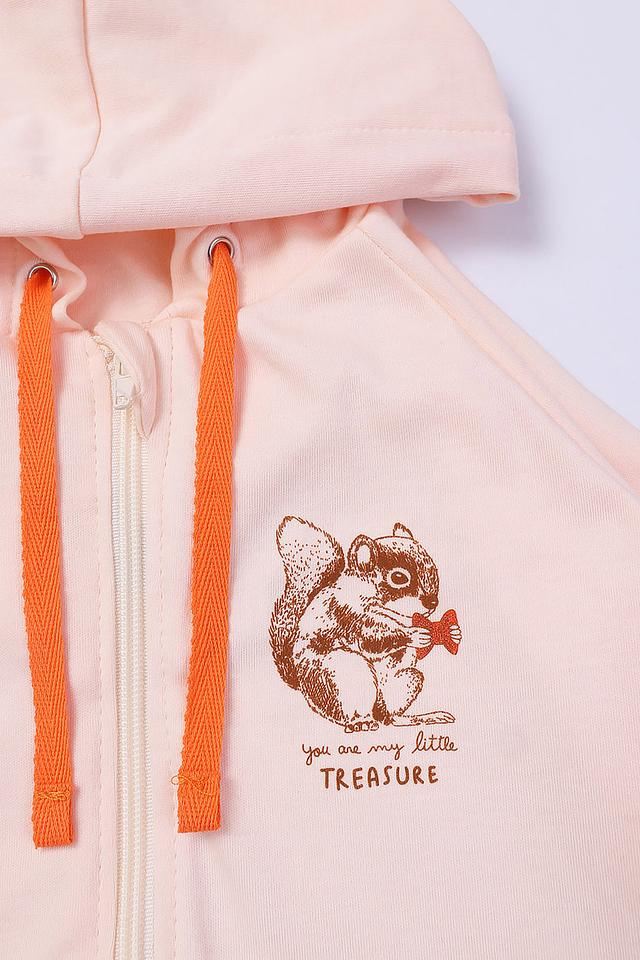 Джемпер имеет удобную застёжку-молнию, капюшон и длинные рукава. Передняя часть украшена ярким принтом с изображением бельчонка и надписью “You are my little TREASURE”.