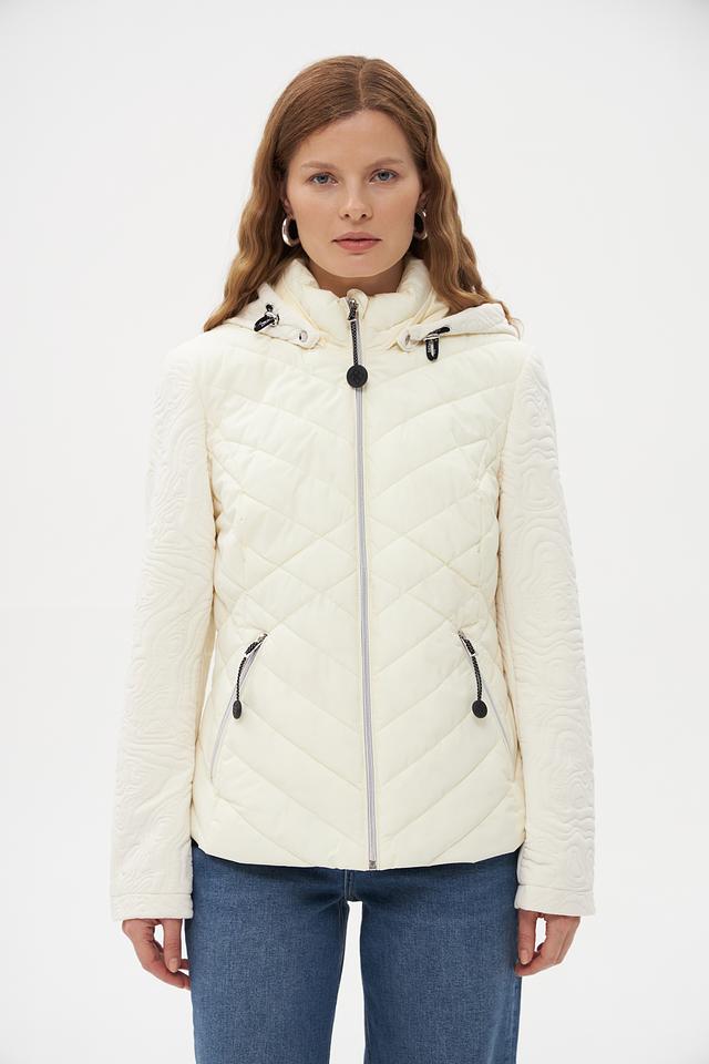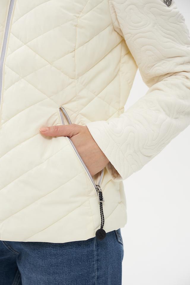 Куртка имеет застежку-молнию, боковые карманы и декоративные элементы на рукавах. Рукава куртки выполнены из текстурированной ткани с геометрическим рисунком, что придает ей оригинальность.