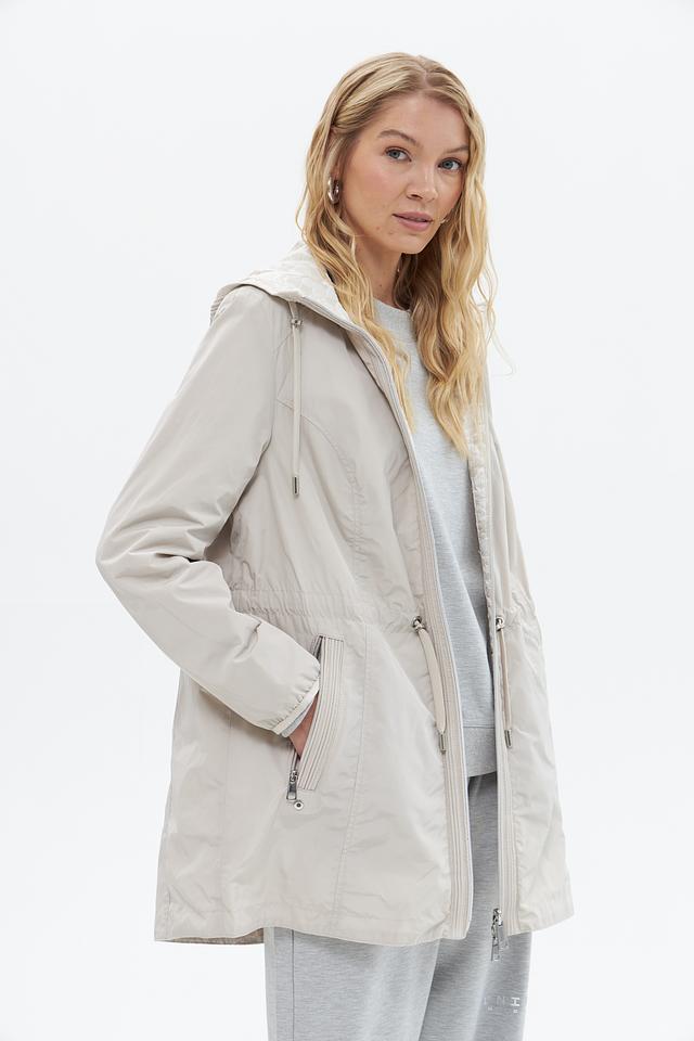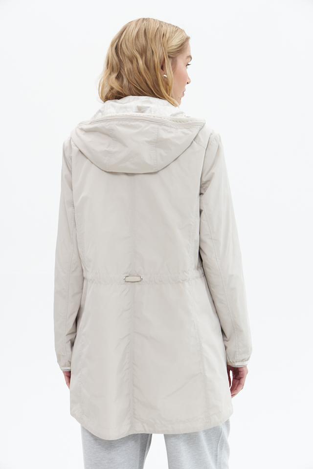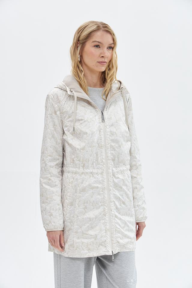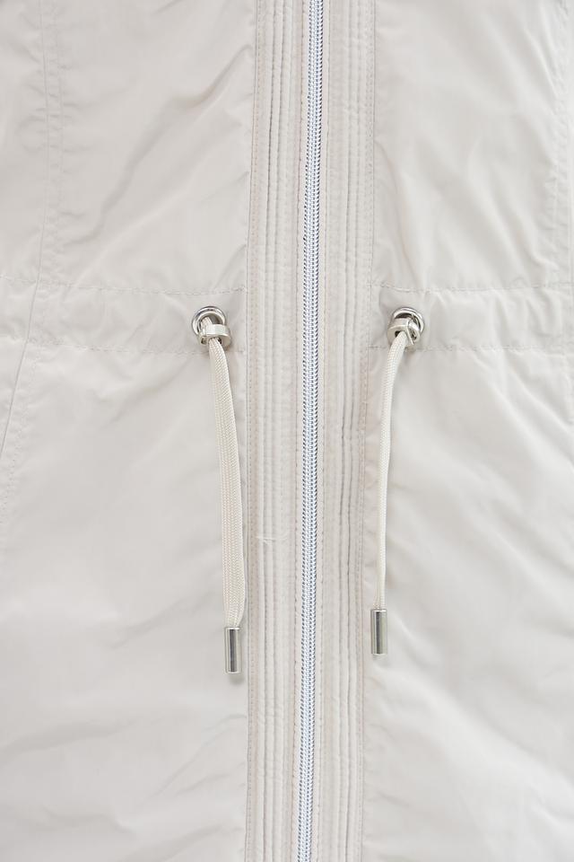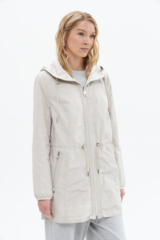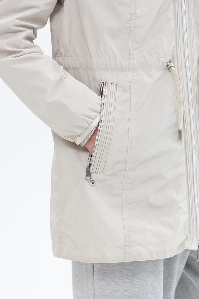 Куртка имеет прямой крой, капюшон со шнурком для регулировки и застегивается на молнию. Боковые карманы на молнии обеспечивают безопасное хранение необходимых вещей.
