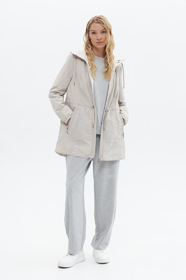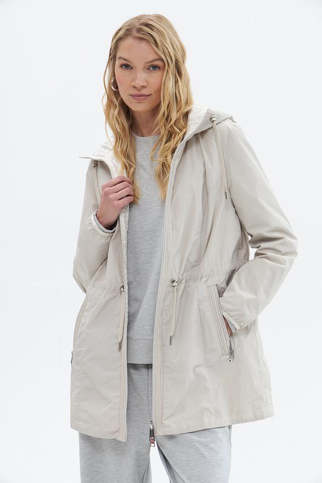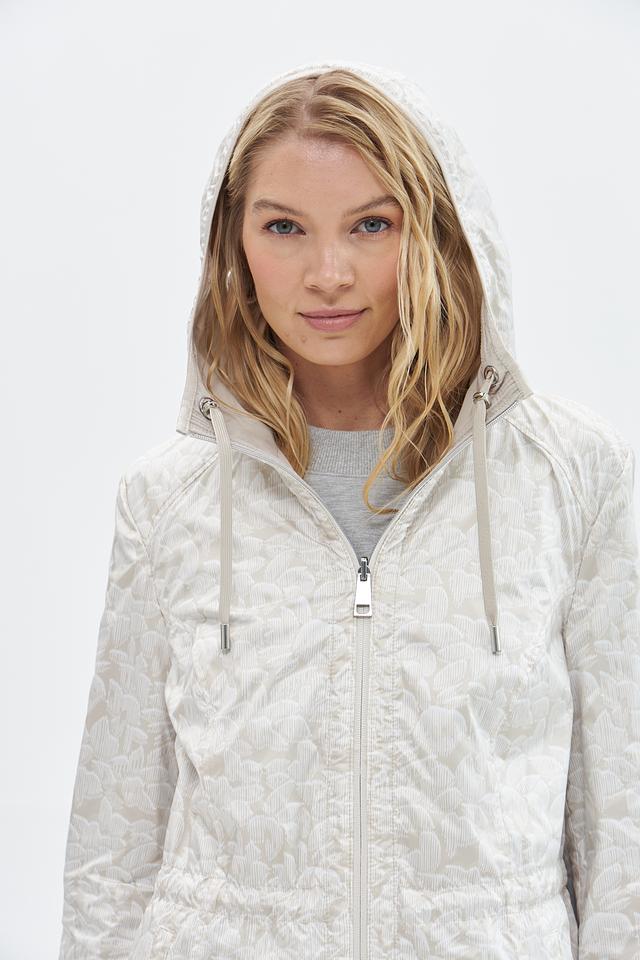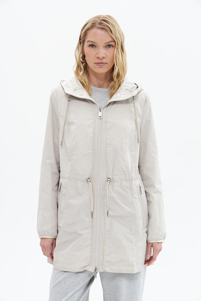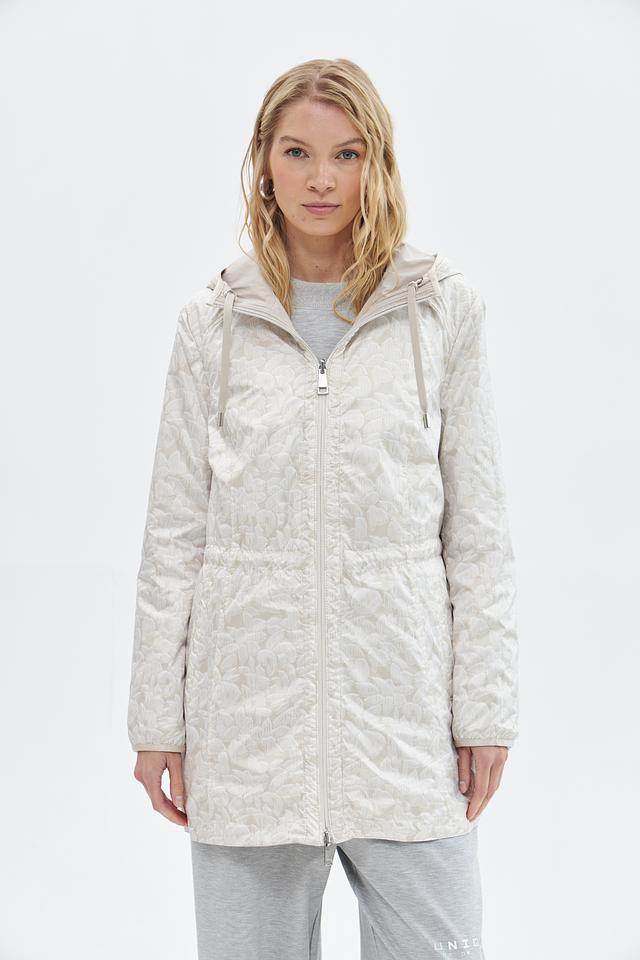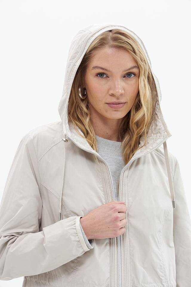 Куртка имеет прямой крой, капюшон со шнурком для регулировки и застегивается на молнию. Боковые карманы на молнии обеспечивают безопасное хранение необходимых вещей.
