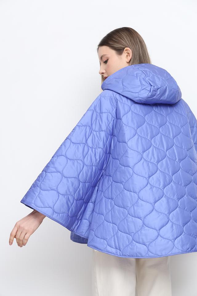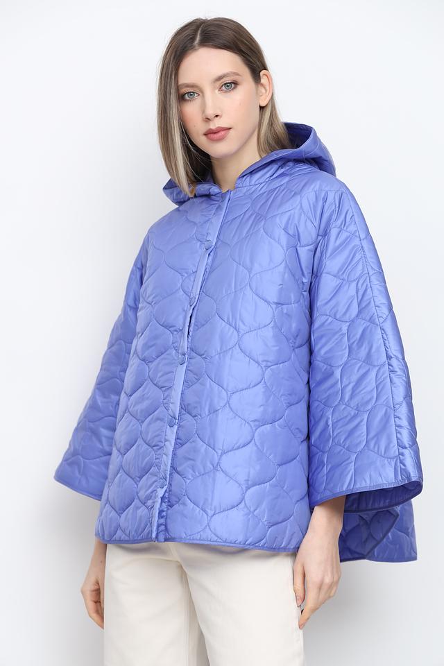 Модель имеет прямой крой, капюшон и застегивается на кнопки по всей длине. Рукава куртки выполнены в форме крыльев, что придает ей оригинальный и современный вид. Стеганая текстура добавляет куртке объема и фактурности.