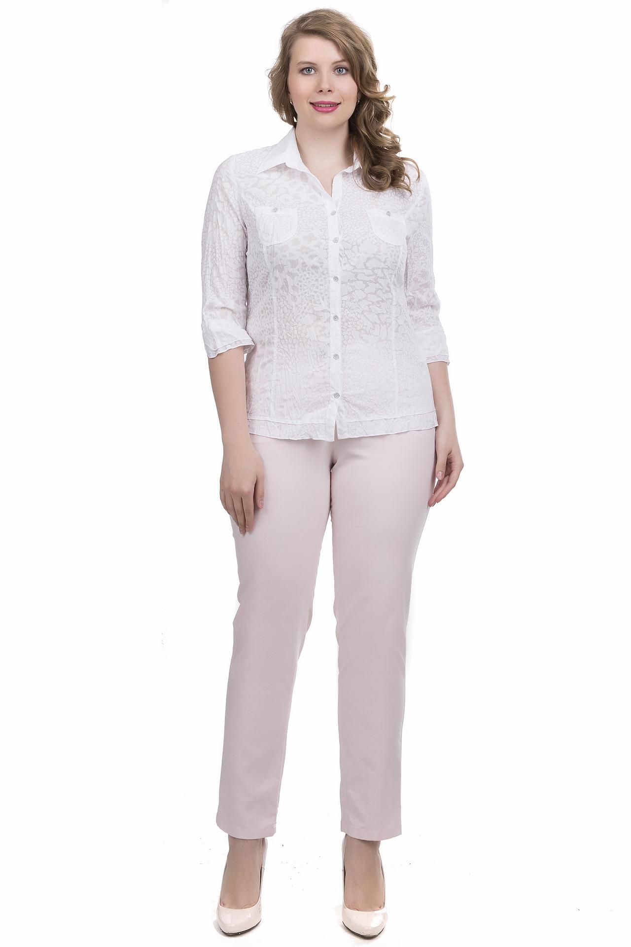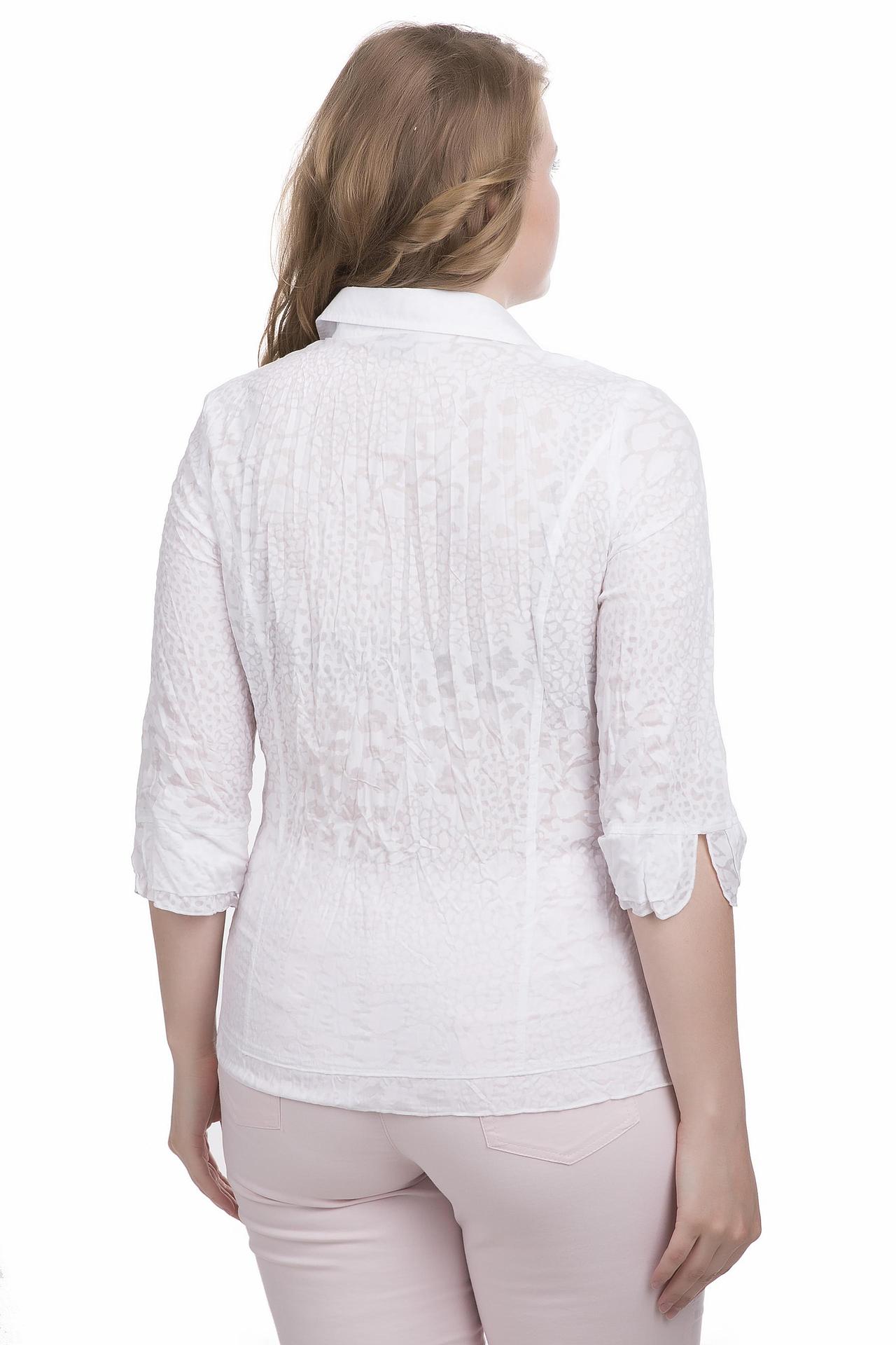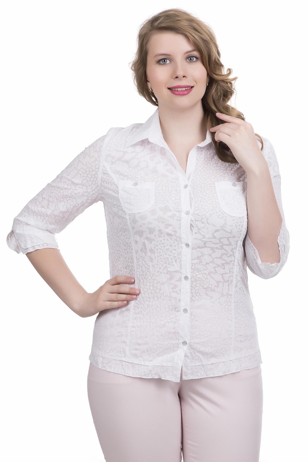 - Изысканный дизайн: Белая блуза украшена нежным фактурным узором, который придает ей уникальность и шарм. Классический воротник и планка с пуговицами подчеркивают деловой стиль, сохраняя при этом женственность.