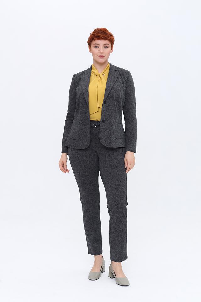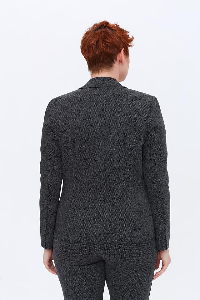 Жакет имеет классический крой с лацканами, застегивается на одну пуговицу. Длинные рукава и приталенный силуэт подчеркивают женственность. Ткань жакета выполнена в мелкую серую клетку, что придает ему элегантный и сдержанный вид.
