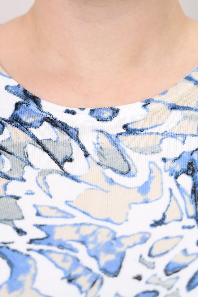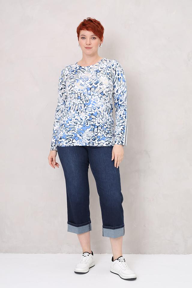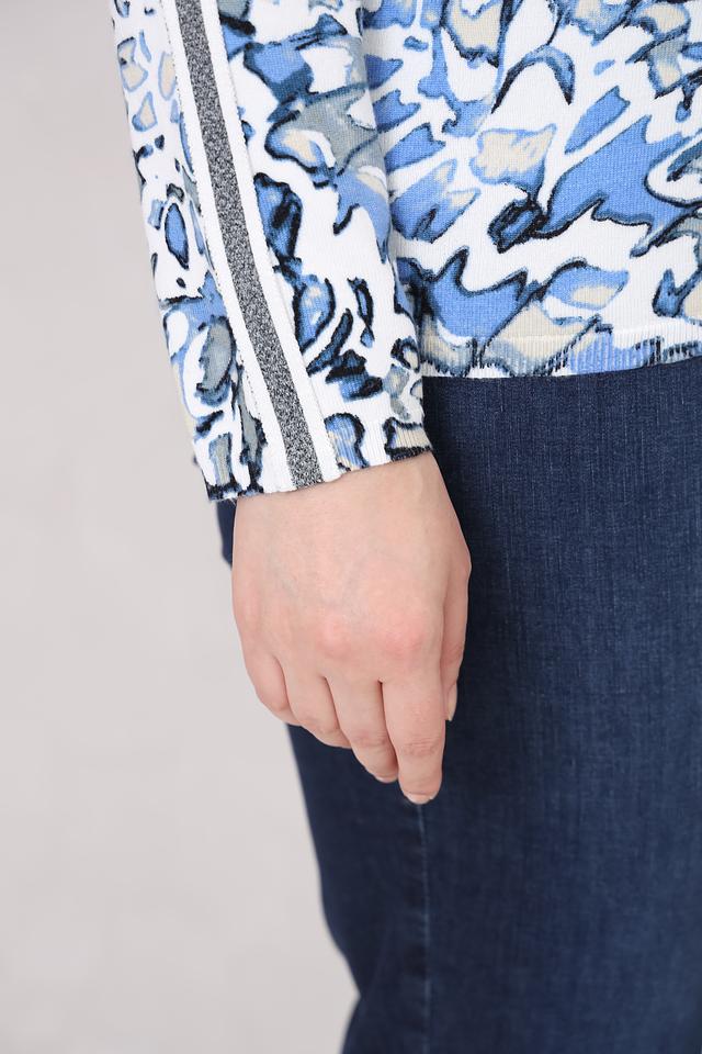 Женский пуловер Lebek голубого цвета с оригинальным абстрактным рисунком и полосками на рукавах. Изготовлен из мягкой вискозы с добавлением полиамида для сохранения формы. Стильный и комфортный выбор для повседневного образа. Состав: вискоза 69%, полиамид 30%, метализ.нить 1%