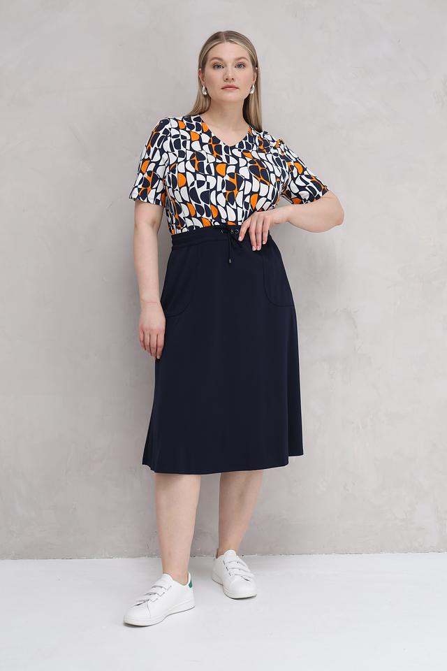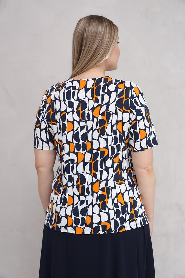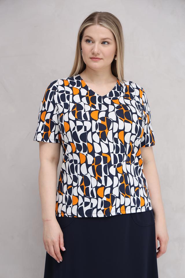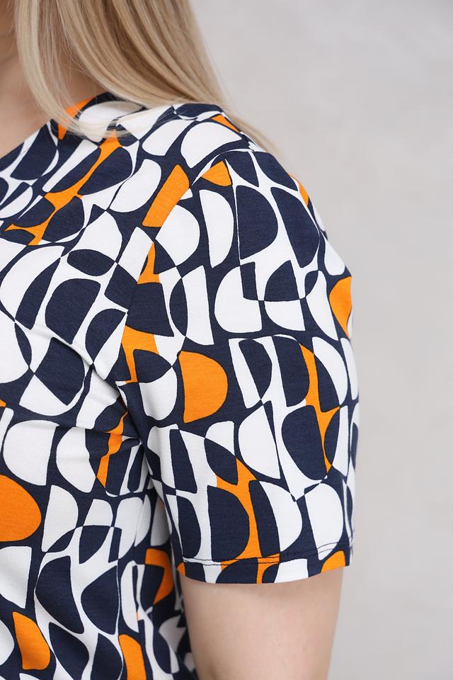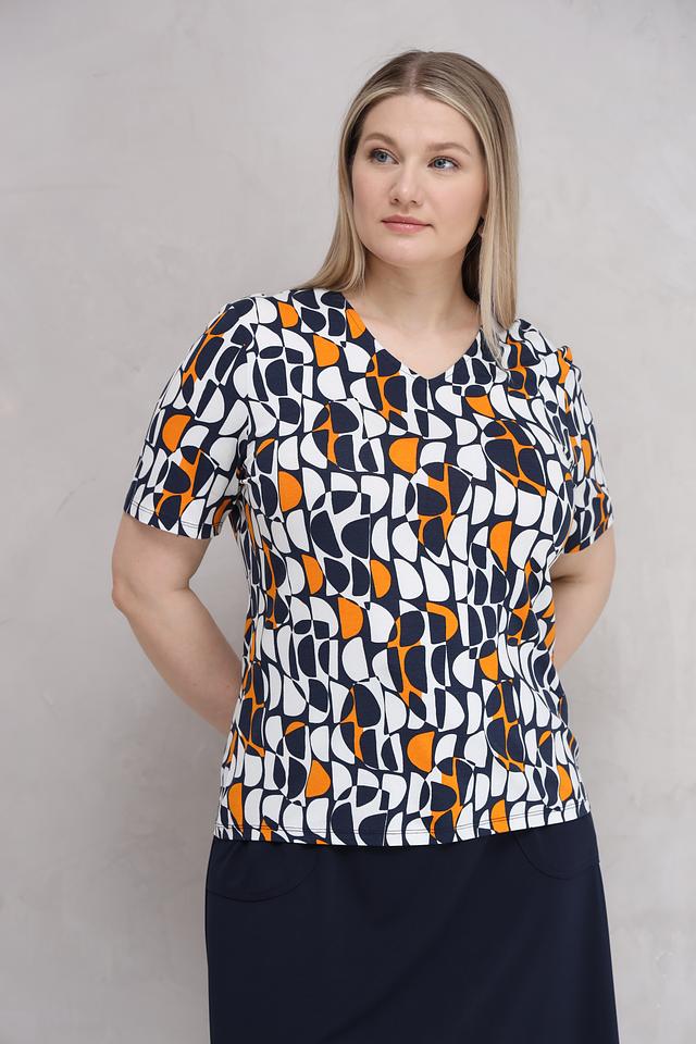 Особенностью данной модели является яркий и запоминающийся геометрический принт, выполненный в оранжево-синей гамме. Он придает образу оригинальность и индивидуальность. Футболка идеально сочетается с юбками, брюками и джинсами, позволяя создавать разнообразные стильные образы.