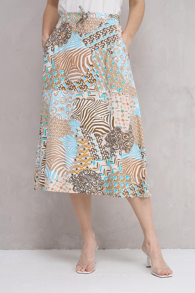 Юбка имеет длину миди и свободный крой, что делает ее универсальной для различных типов фигуры. Особенностью модели является оригинальный принт, сочетающий в себе различные геометрические узоры и оттенки.