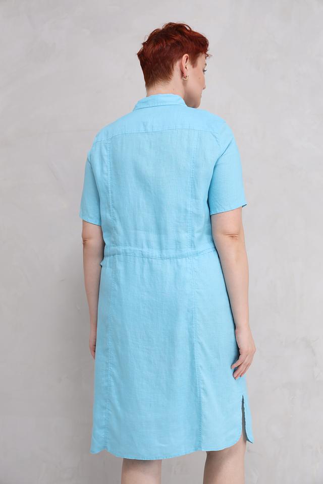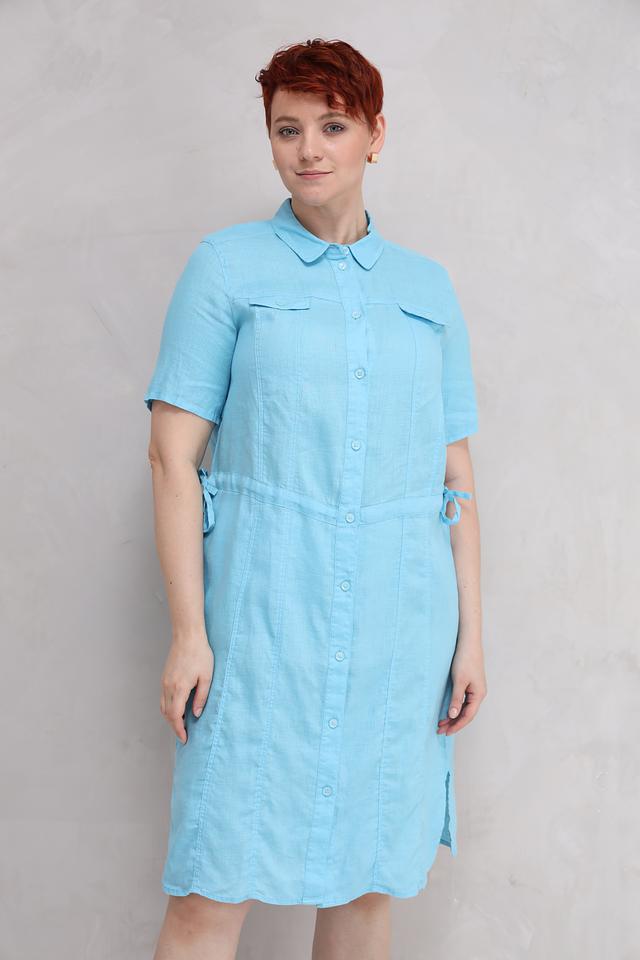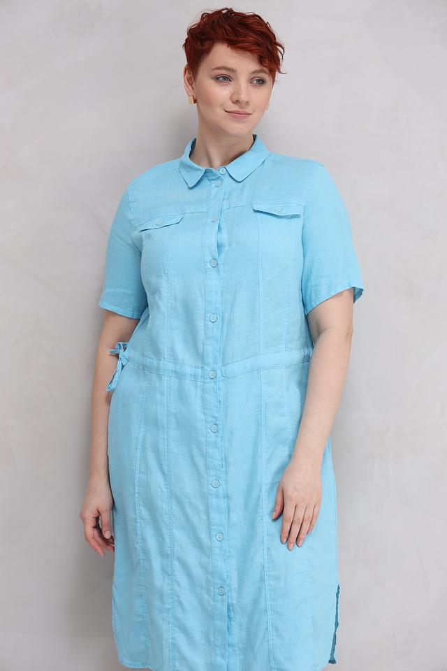 Платье имеет два накладных кармана на груди и боковые разрезы, что добавляет ему практичности и удобства. Голубой цвет платья освежает образ и легко сочетается с различными аксессуарами. Это платье идеально подойдет для повседневной носки, прогулок по городу или отдыха на природе.