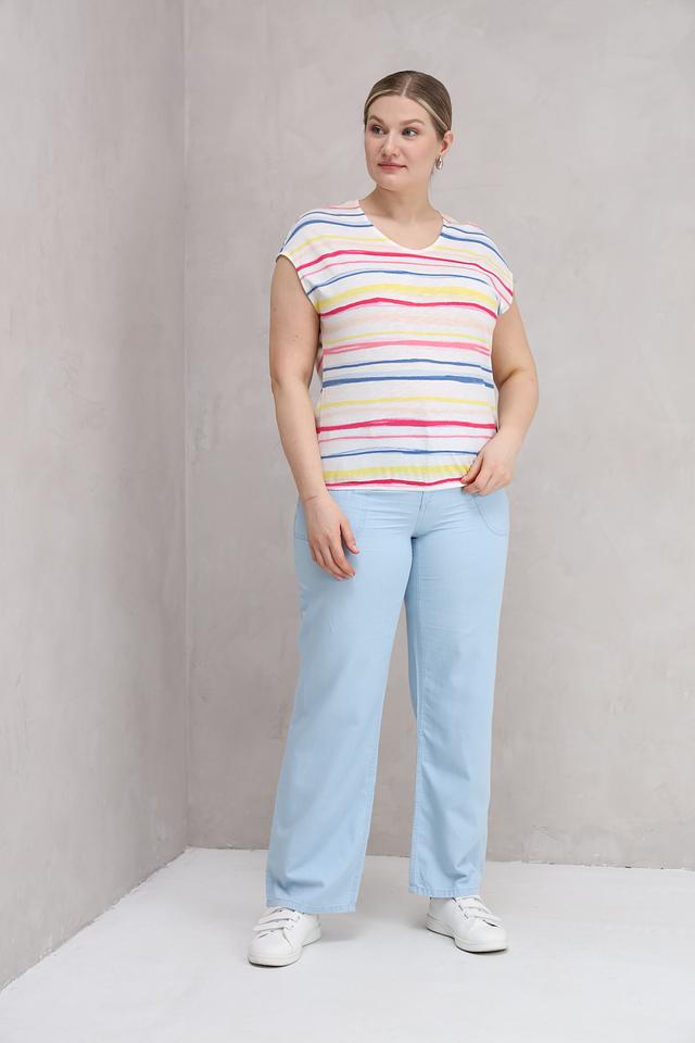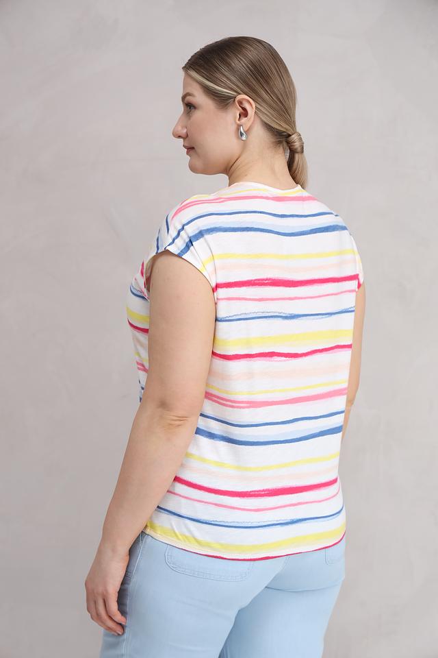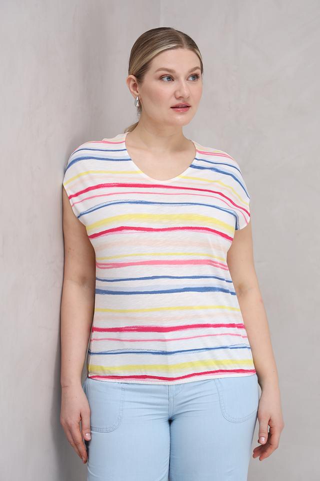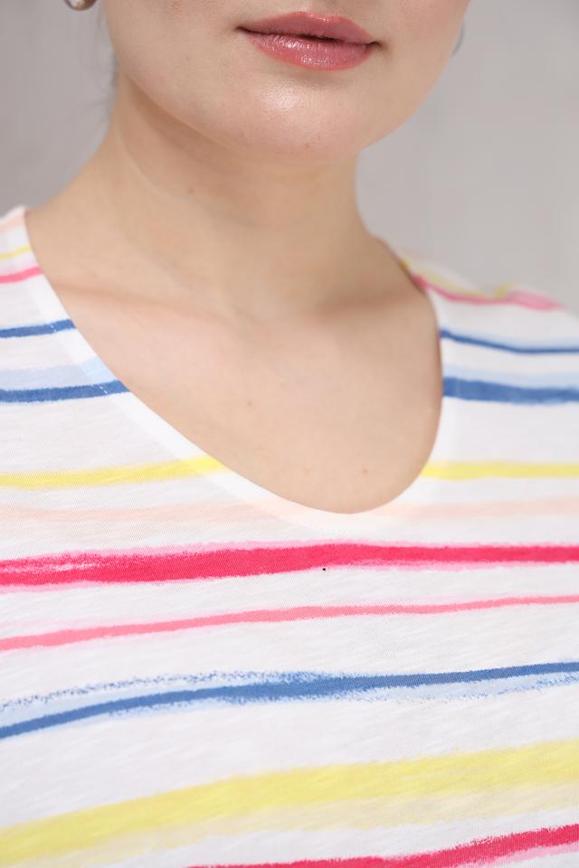 Топ имеет свободный крой, который не сковывает движений, и короткие рукава. Особенностью модели является яркий дизайн в широкую полоску, выполненную в различных цветах: белом, красном, жёлтом и синем. V-образный вырез горловины добавляет изящества.