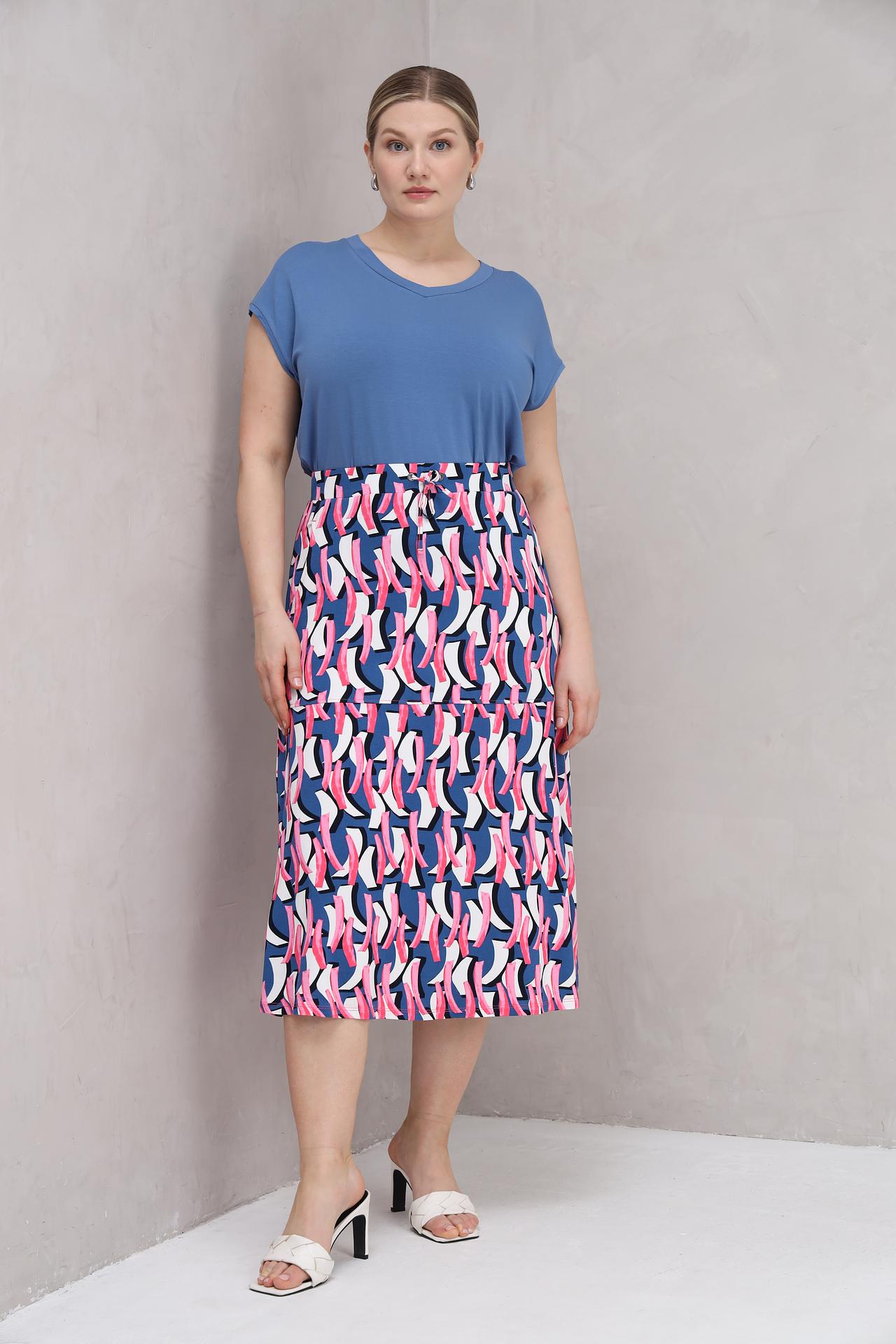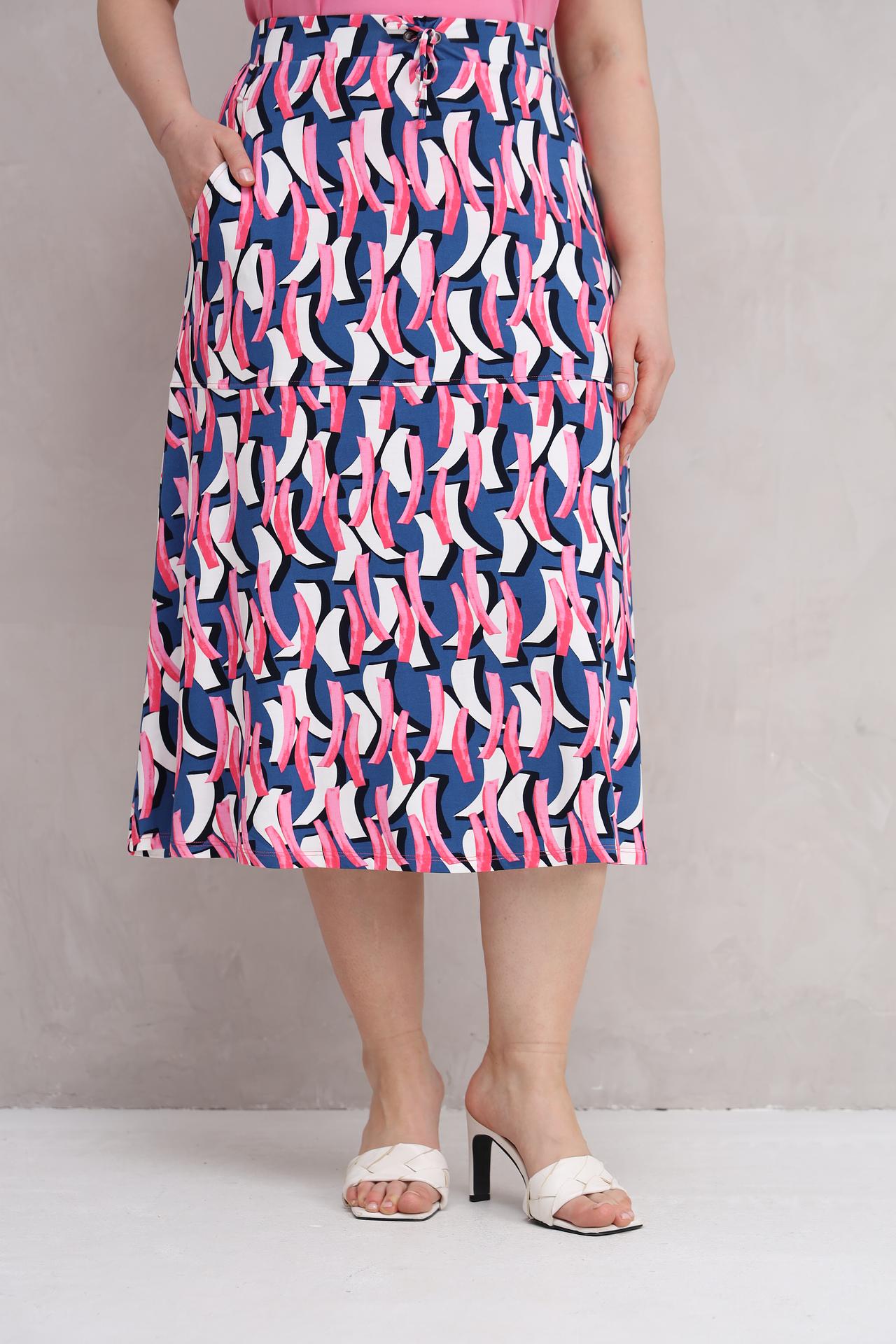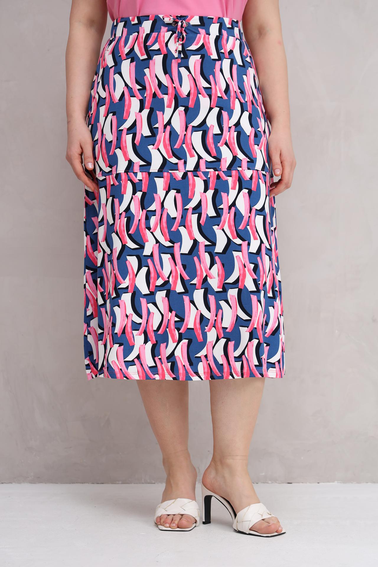 Стильная женская юбка Lebek выполнена из высококачественной вискозы с добавлением эластана (95% вискоза, 5% эластан), что обеспечивает исключительный комфорт и идеальную посадку. Эта миди-юбка украшена ярким абстрактным принтом в синих, розовых, белых и черных тонах, добавляя динамичности и индивидуальности вашему повседневному или летнему образу.