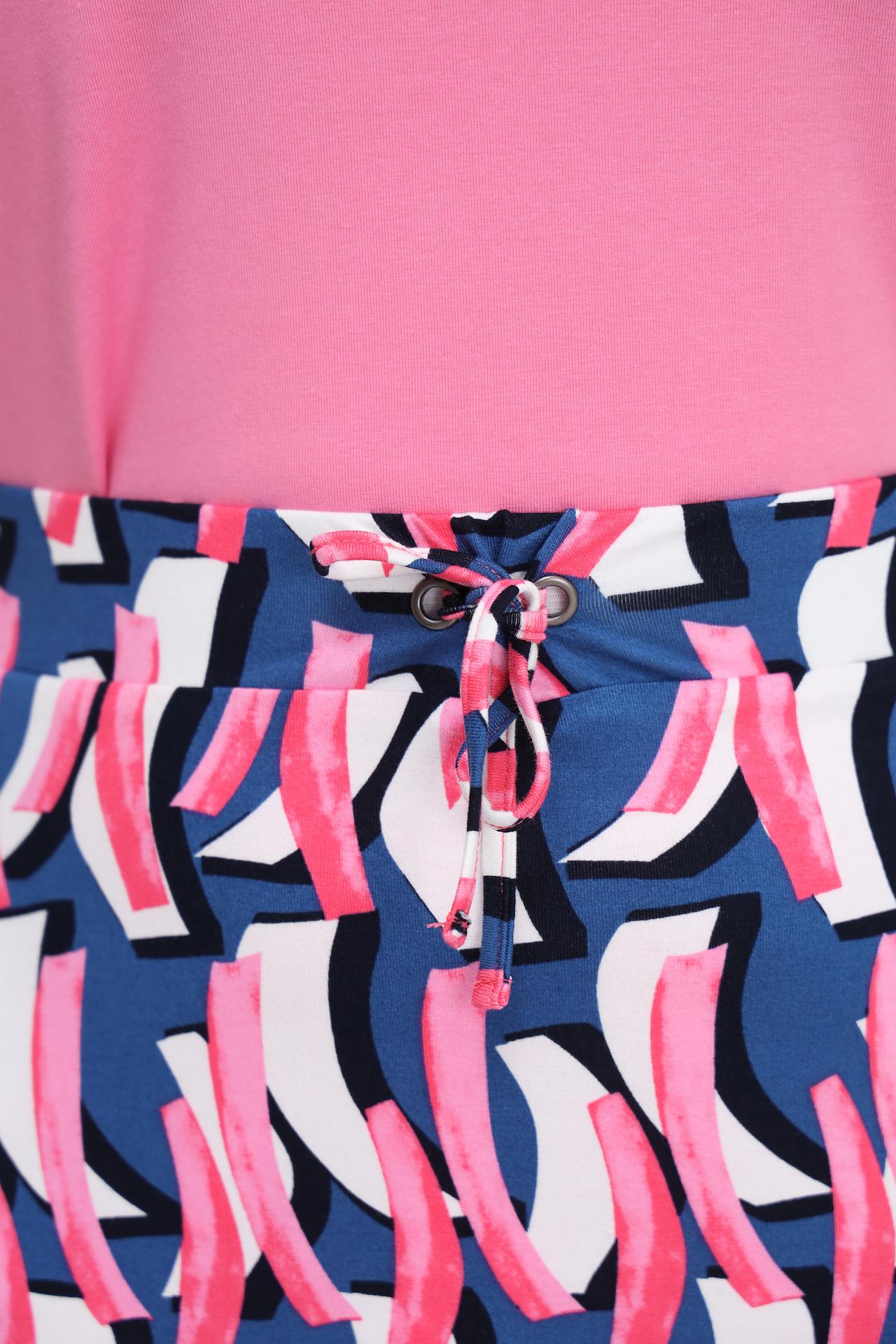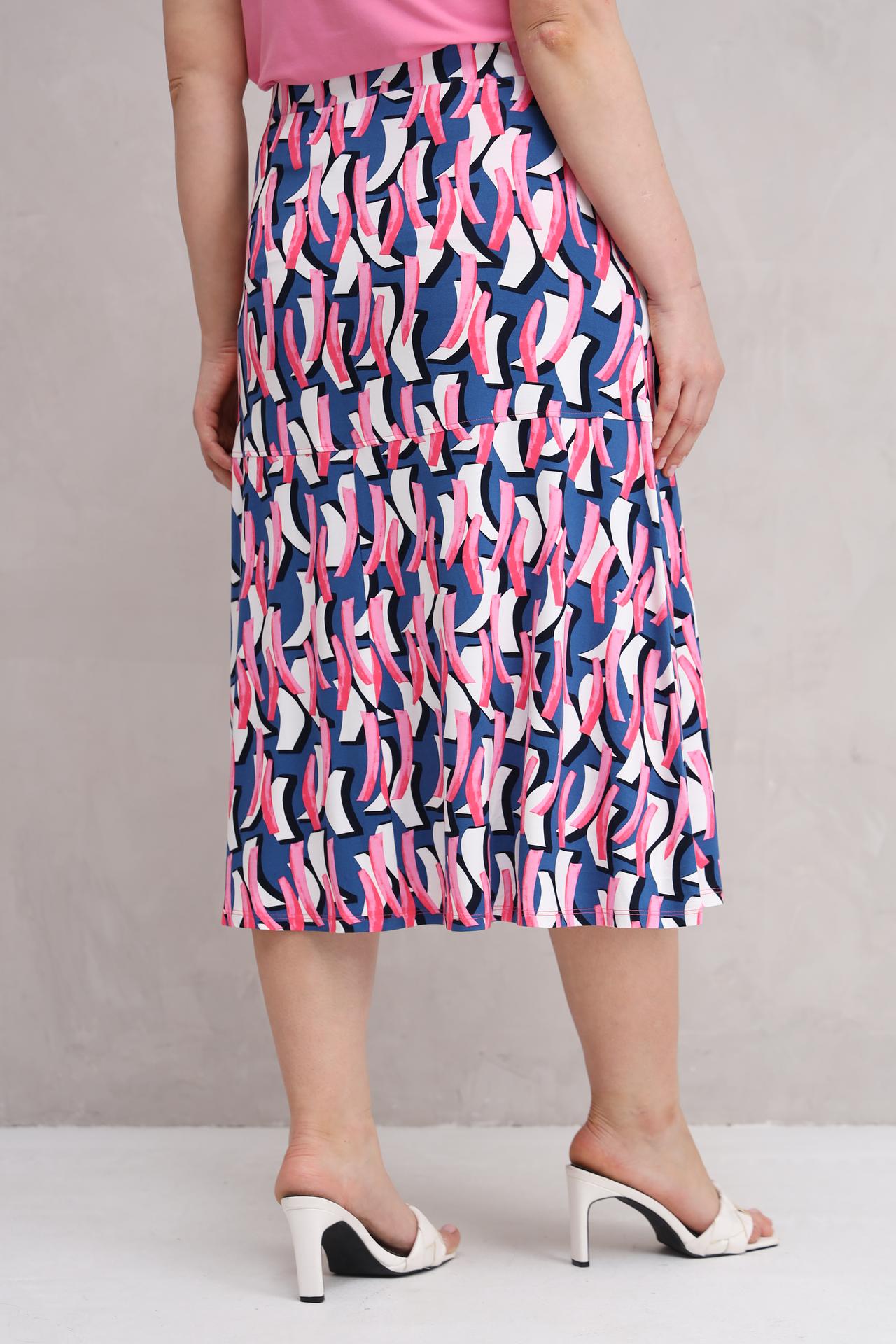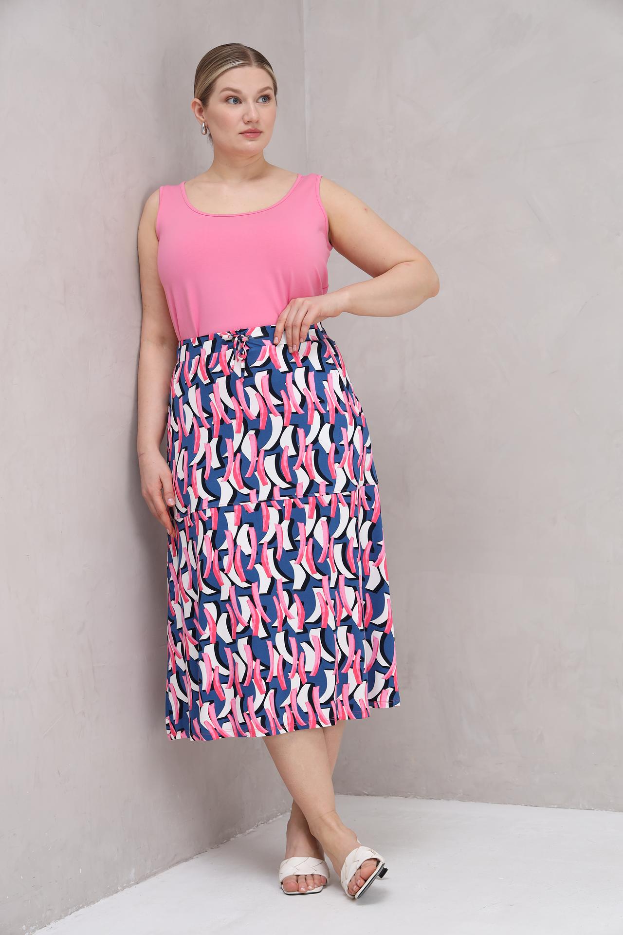 Стильная женская юбка Lebek выполнена из высококачественной вискозы с добавлением эластана (95% вискоза, 5% эластан), что обеспечивает исключительный комфорт и идеальную посадку. Эта миди-юбка украшена ярким абстрактным принтом в синих, розовых, белых и черных тонах, добавляя динамичности и индивидуальности вашему повседневному или летнему образу.