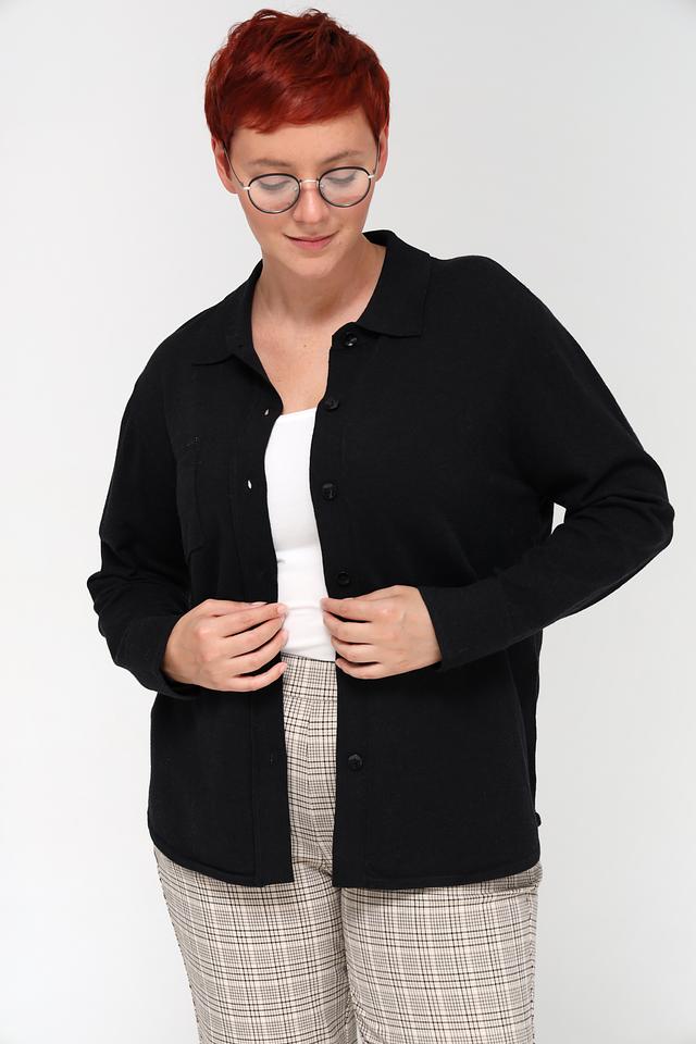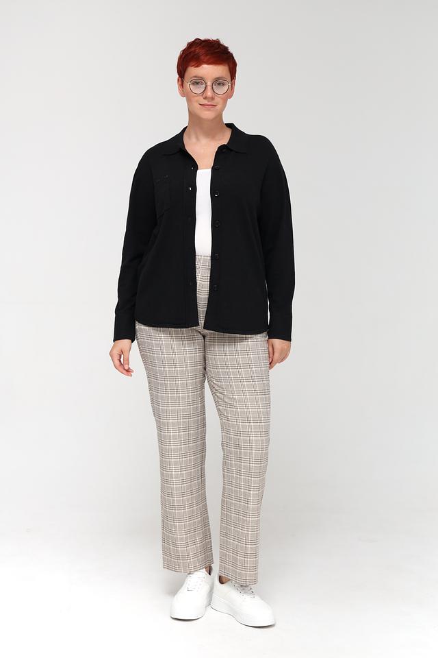 Рубашка имеет прямой крой, длинные рукава и воротник. На груди расположен накладной карман, добавляющий образу функциональность и стиль. Застёжка осуществляется на пуговицы по всей длине.