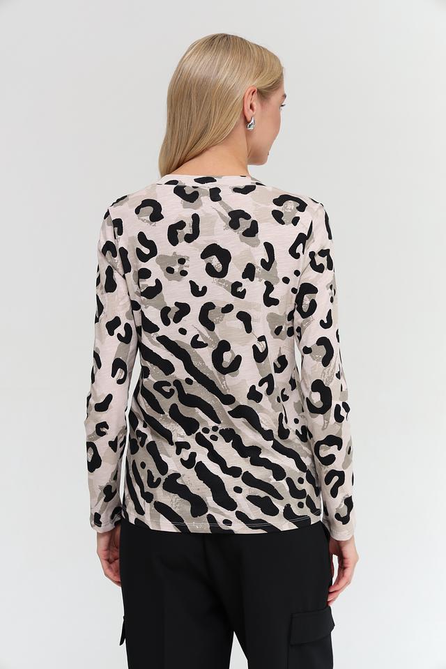 Лонгслив имеет свободный крой, который не сковывает движения. V-образный вырез горловины придает образу женственность. Главная особенность модели – эффектный принт, сочетающий в себе элементы анималистических рисунков.