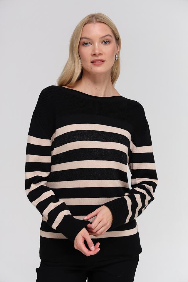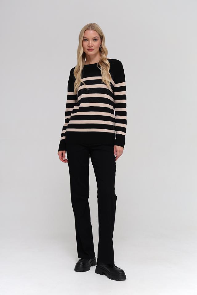 Основной цвет пуловера – чёрный, он разбавлен широкими бежевыми полосами, которые визуально освежают образ. В составе изделия преобладают натуральные и синтетические волокна: 48% полиакрил, 48% хлопок и 4% метализированная нить.