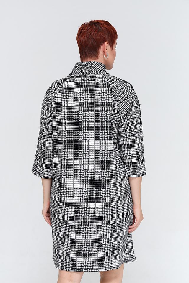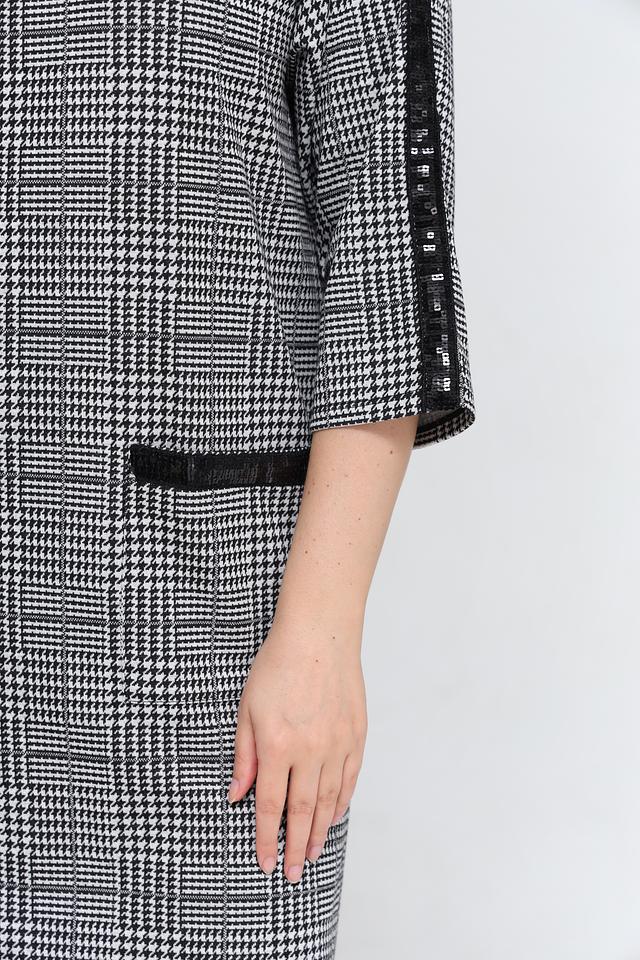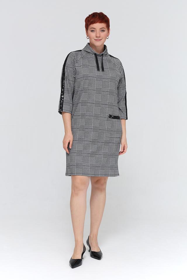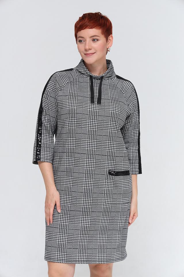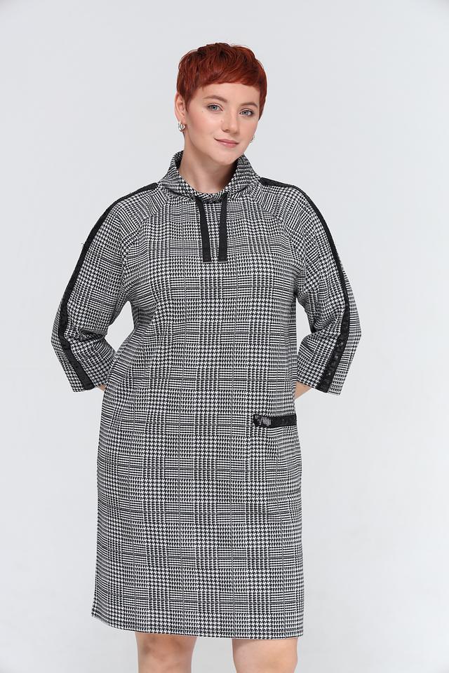 Это стильное платье от бренда Lebek выполнено в классическом чёрно-белом цвете и украшено клетчатым принтом. Модель имеет удобный капюшон и рукава 3/4 с контрастными чёрными полосами по бокам.
