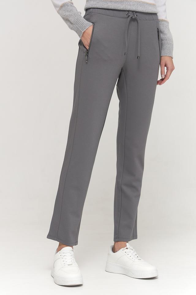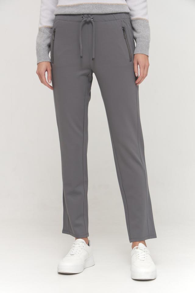 Брюки имеют прямой крой и эластичный пояс с кулиской, что обеспечивает удобную посадку по фигуре. Манжеты внизу брюк добавляют образу непринужденности и стиля. На брюках предусмотрены два боковых кармана на молнии.