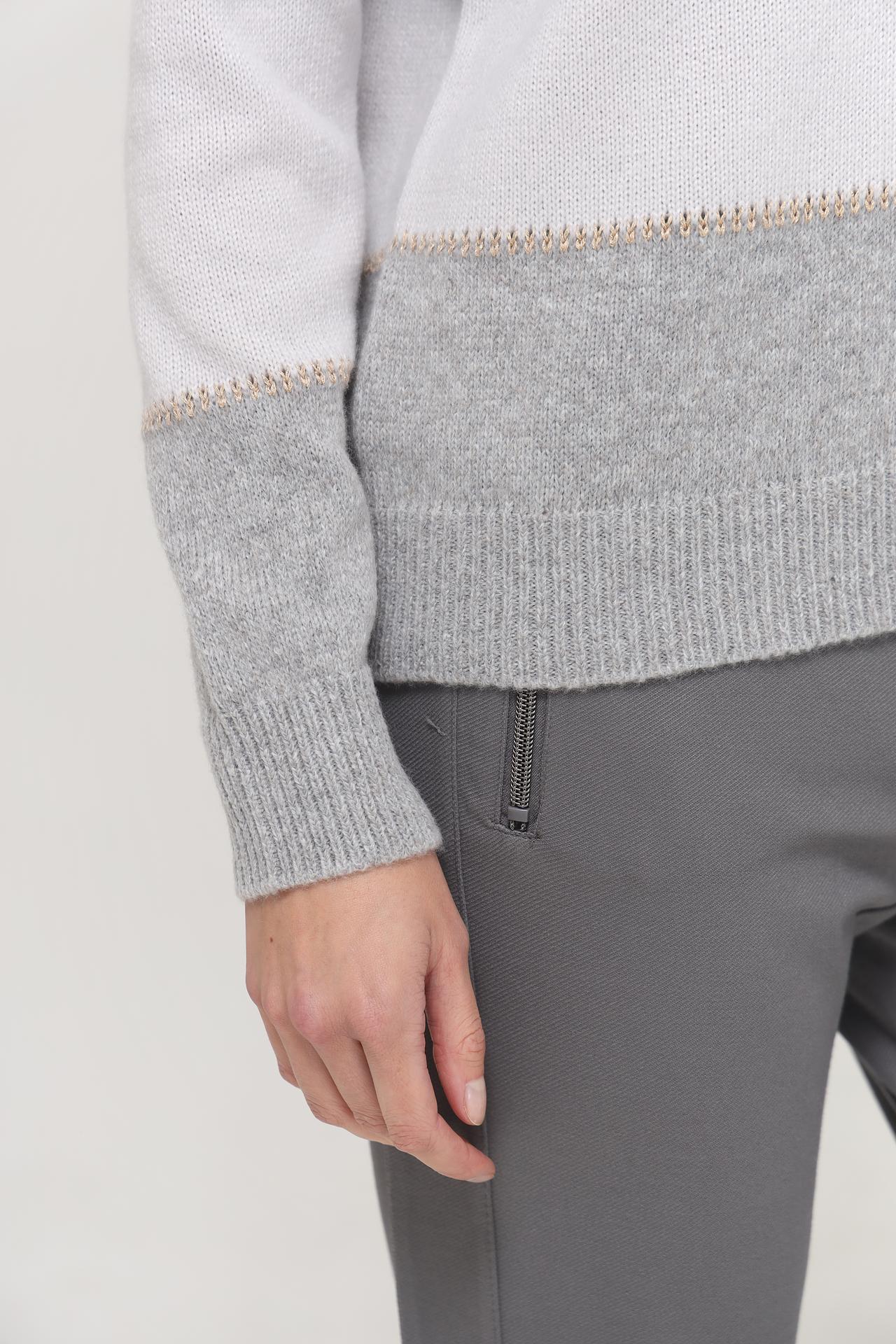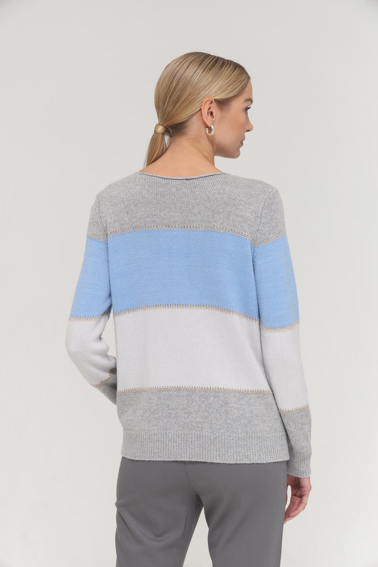Стильный и комфортный пуловер от бренда Lebek станет незаменимой частью вашего гардероба. Модель выполнена в приятной цветовой гамме, сочетающей серые, голубые и белые оттенки, дополненной изящной золотистой отделкой. Такой дизайн подойдет как для повседневных образов, так и для более элегантных выходов.