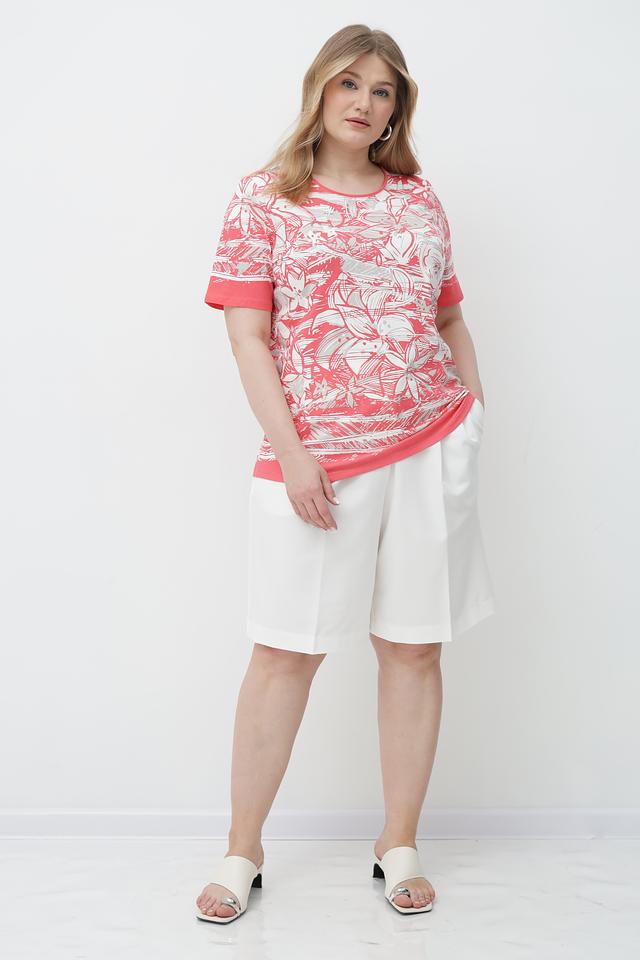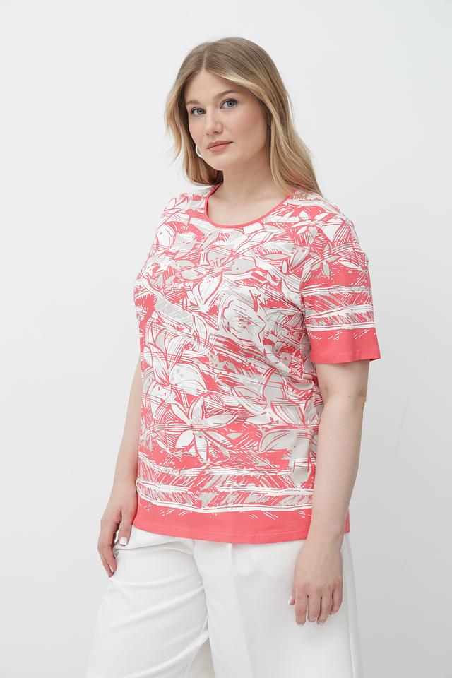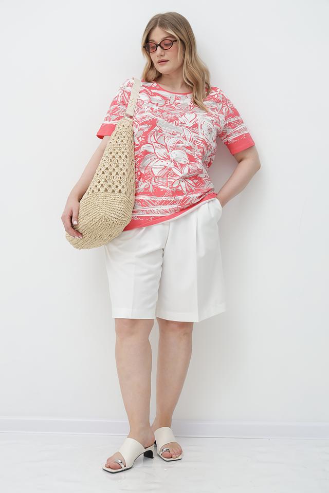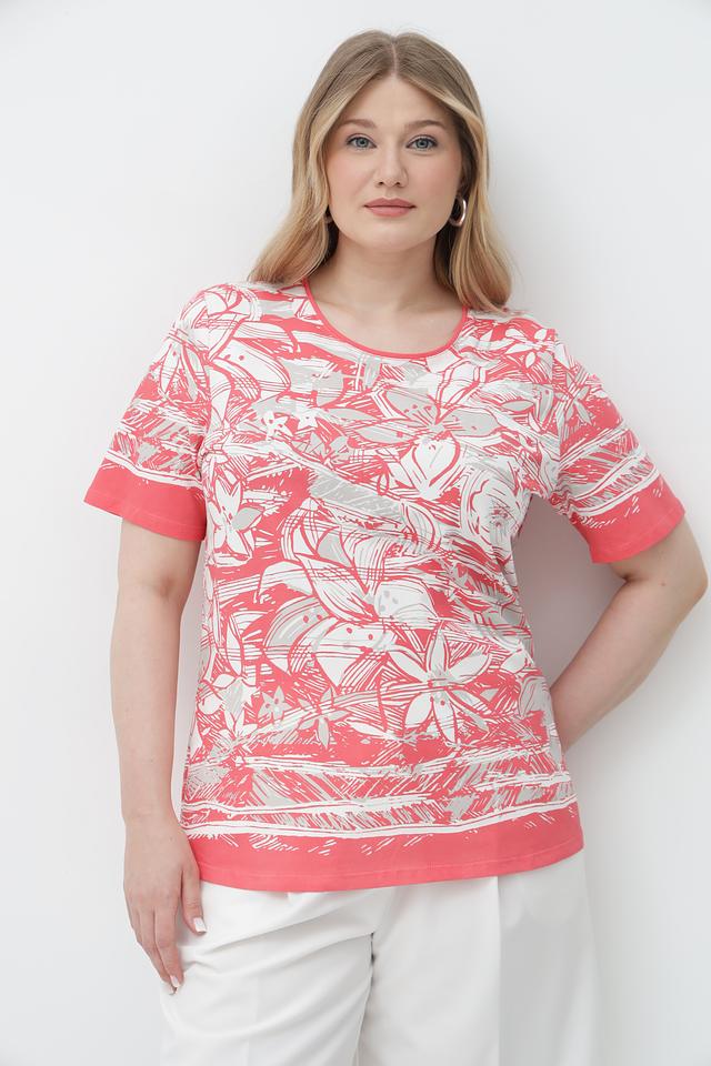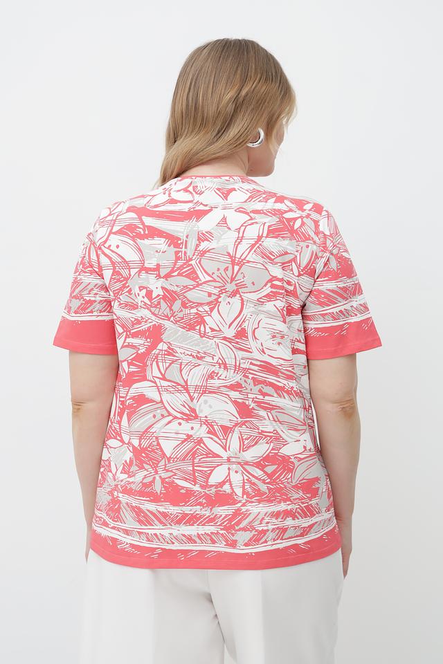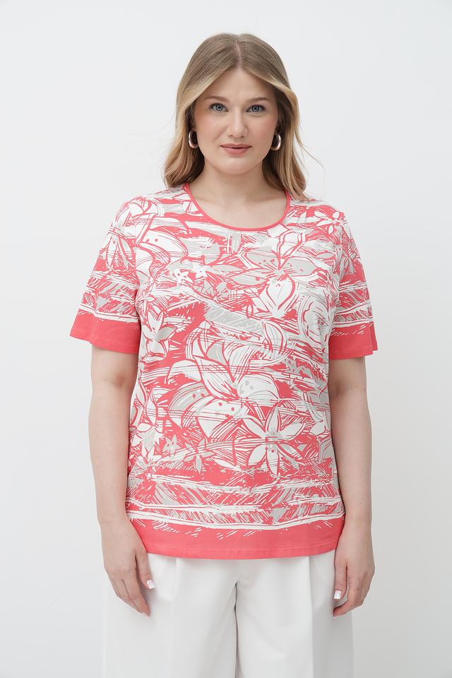 Модель имеет прямой крой, короткий рукав и круглый вырез горловины. Футболка украшена ярким цветочным принтом в коралловых и белых тонах, который придаёт ей летнее настроение.