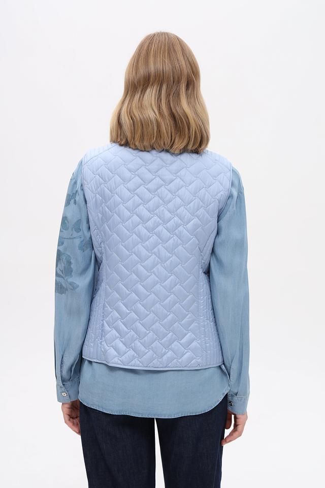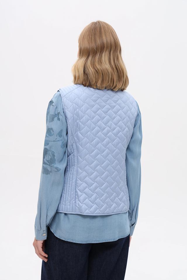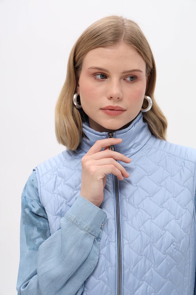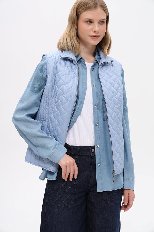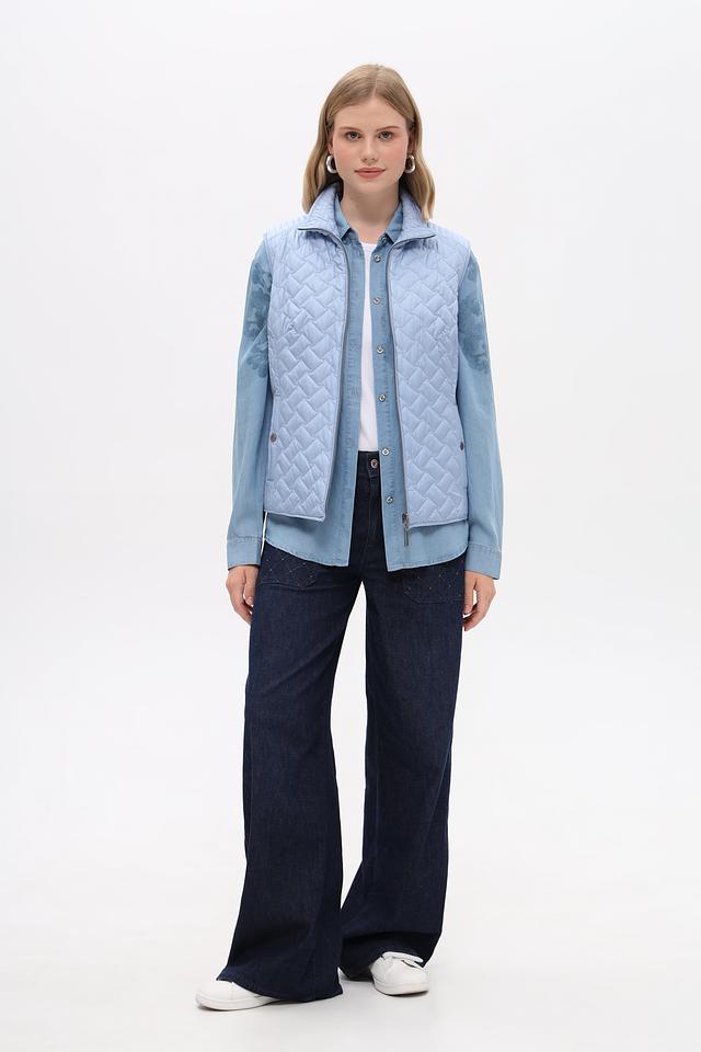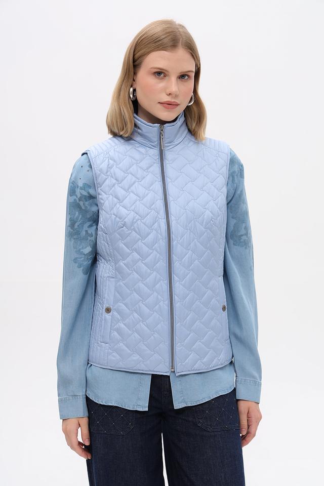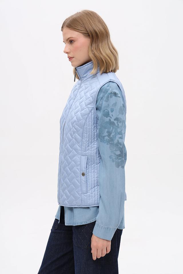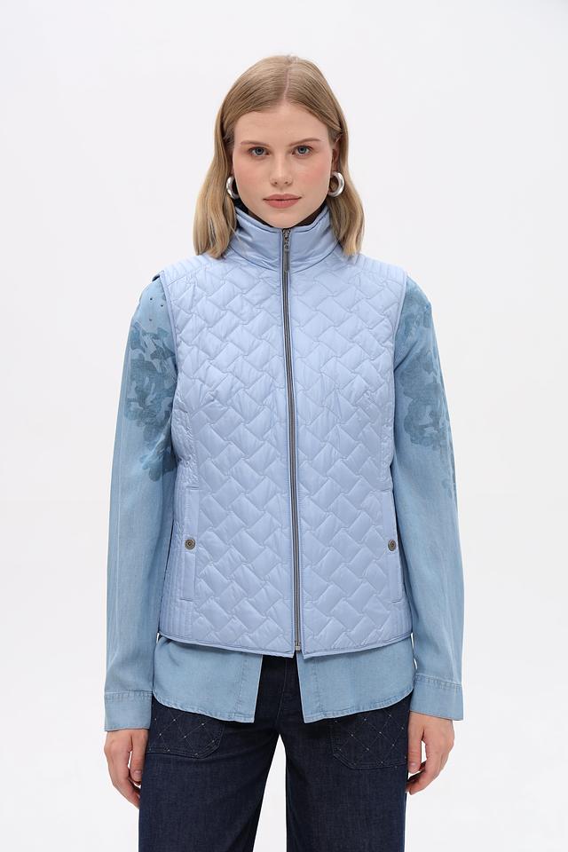 Женский жилет от бренда Lebek выполнен в светло-голубом цвете. Модель имеет стеганую текстуру, которая придает ей стильный вид.