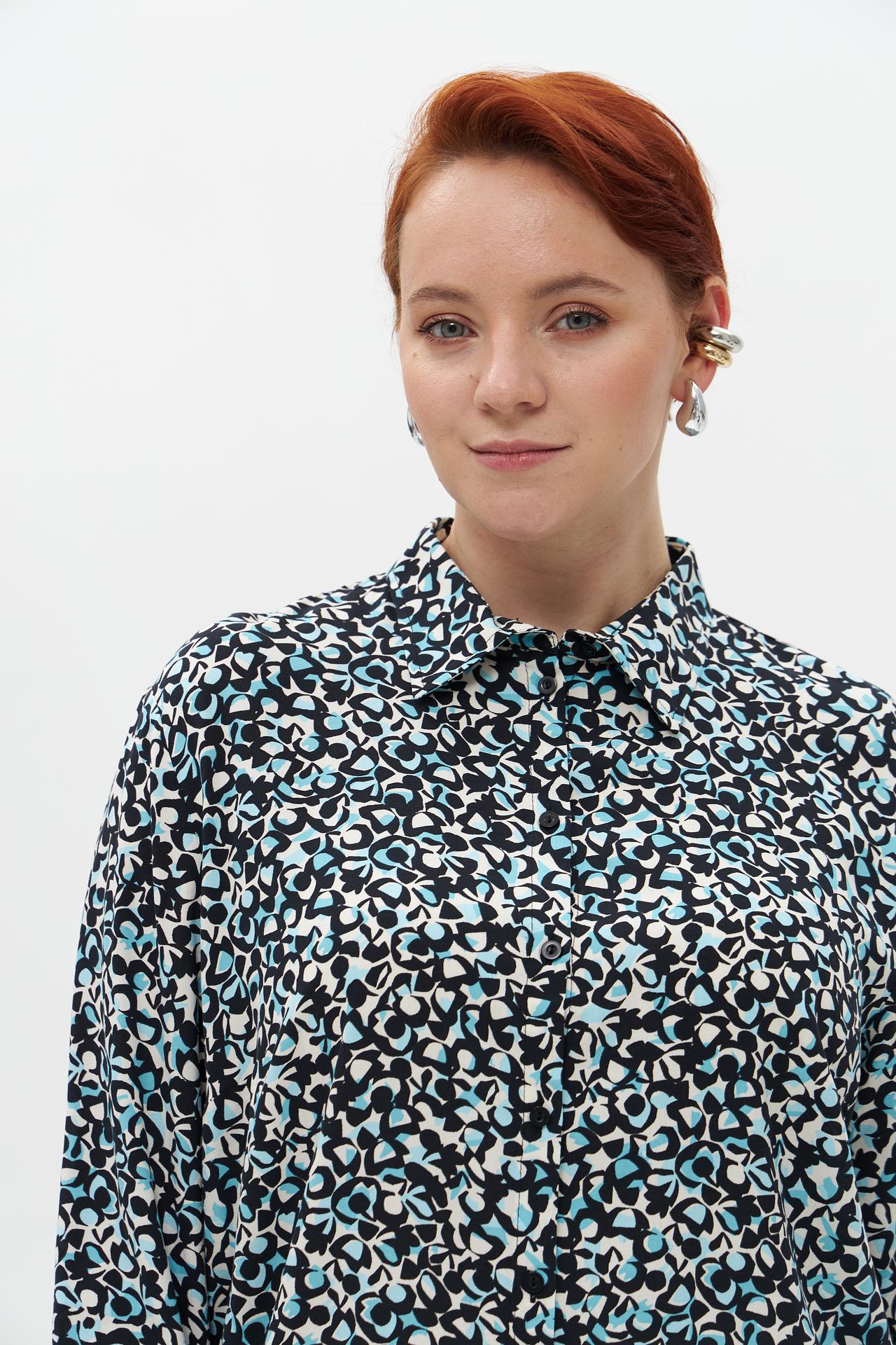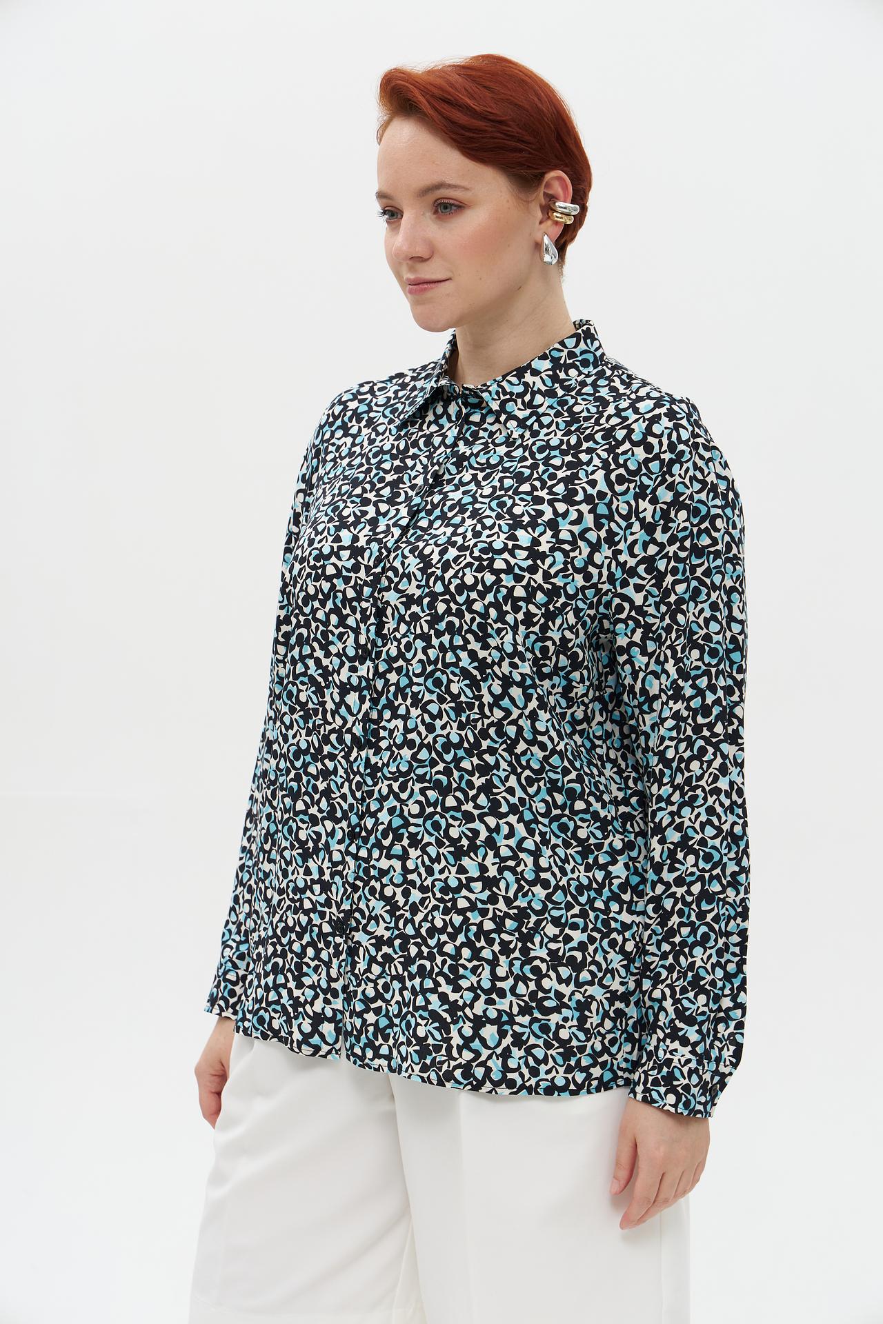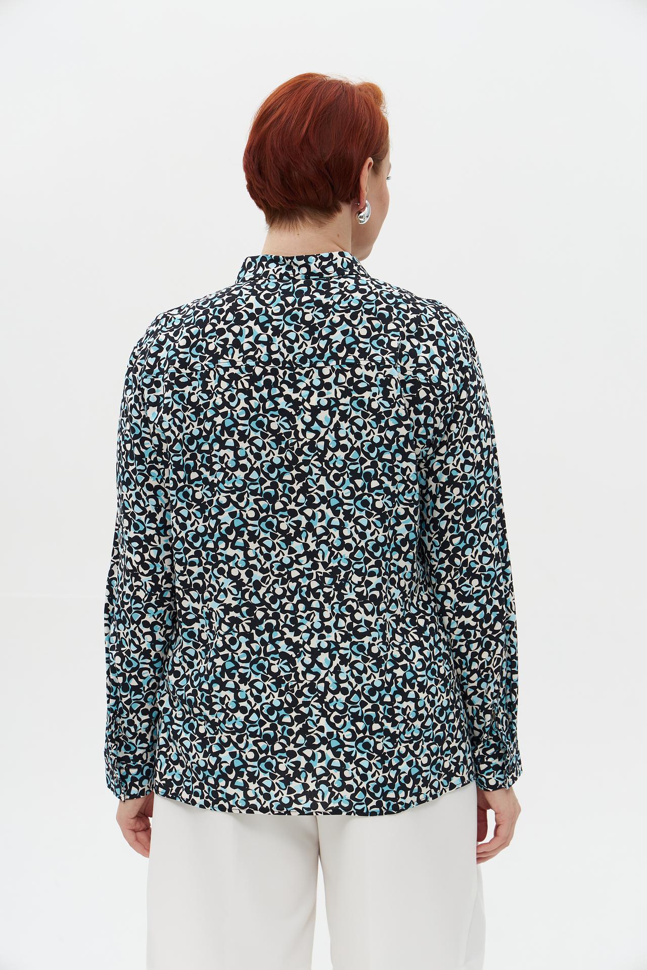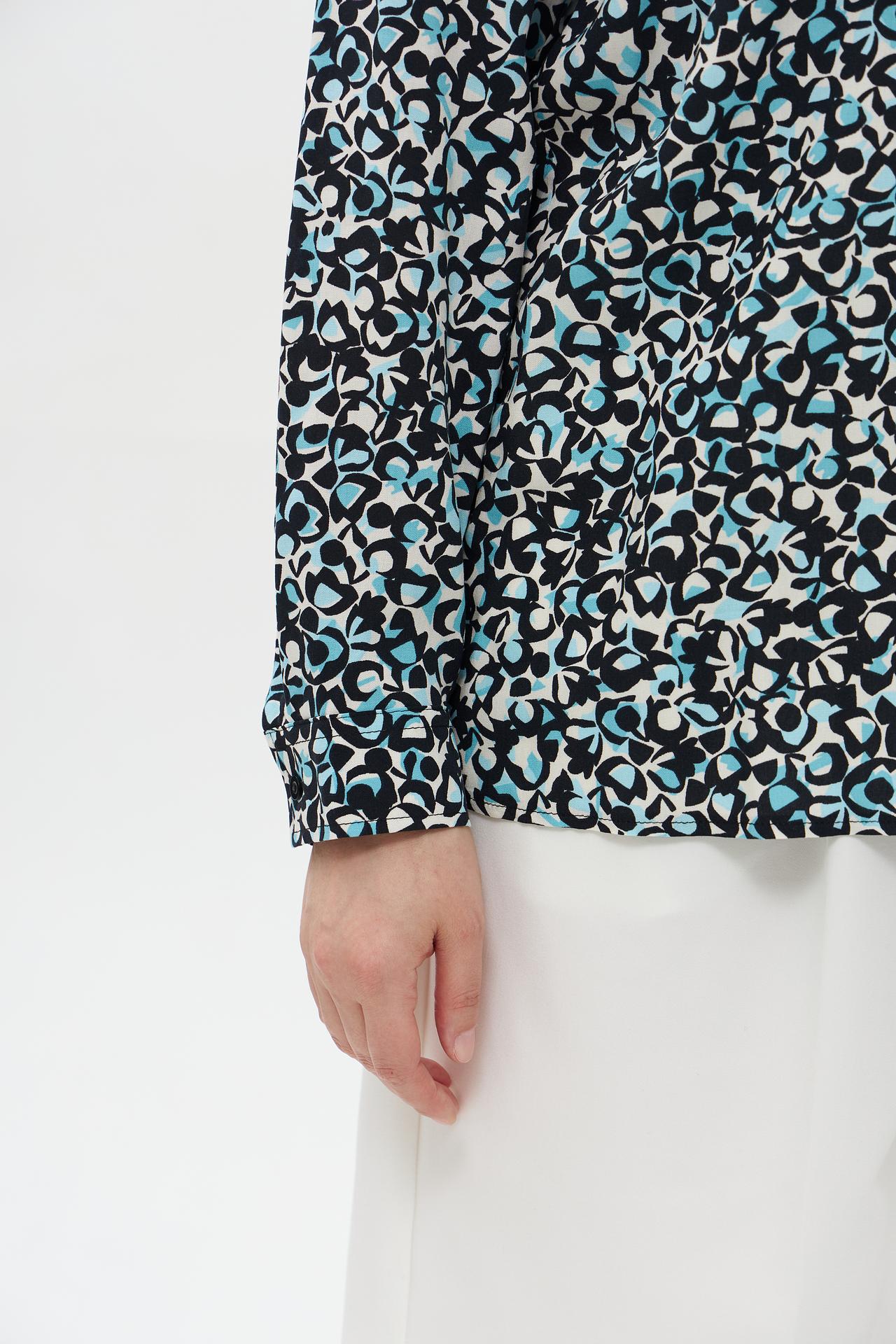 Дизайн блузки украшен динамичным геометрическим принтом в сочетании чёрного, белого и голубого оттенков, что добавляет изделию современности и оригинальности. Классический воротник и полноразмерные рукава с манжетами подчеркивают элегантность, делая блузу подходящей как для офисного стиля, так и для неформальных встреч.