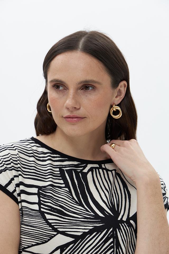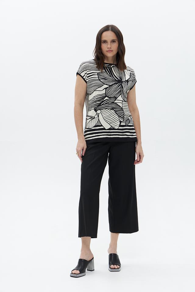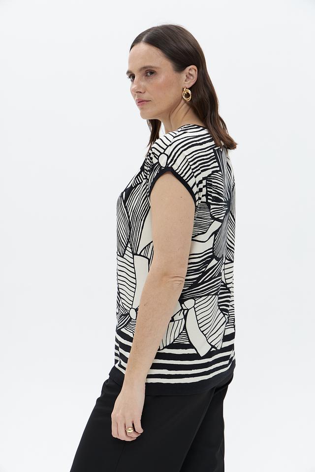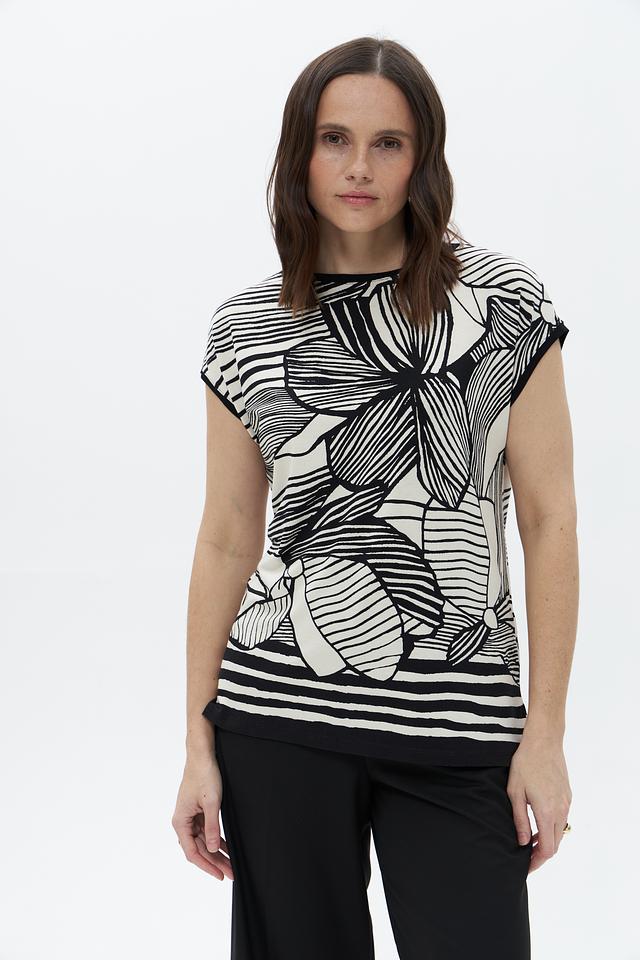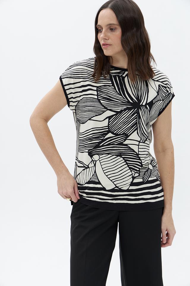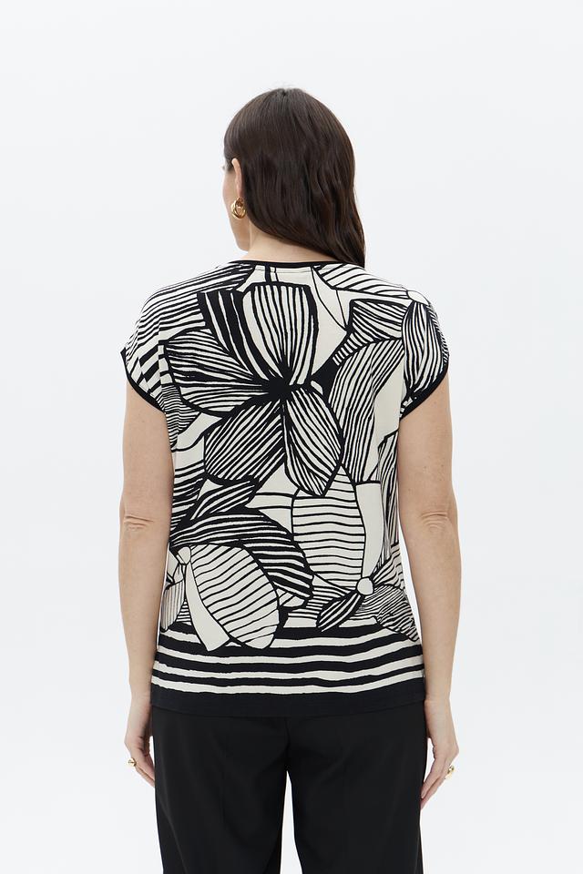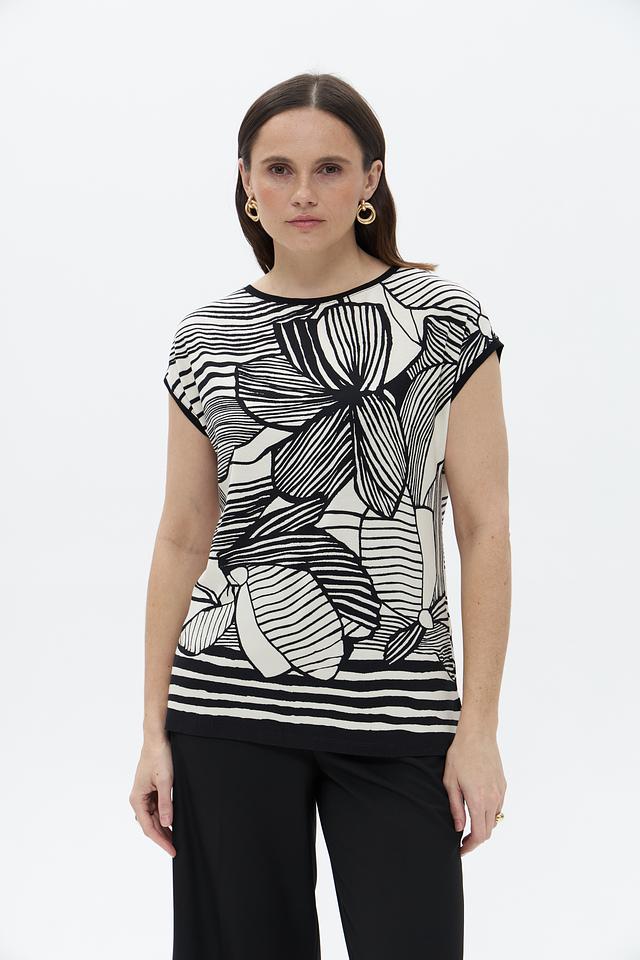 Футболка имеет свободный крой и короткий рукав, что делает ее идеальной для теплой погоды. Оригинальный черно-белый принт с изображением цветов придает ей особый шарм и индивидуальность.