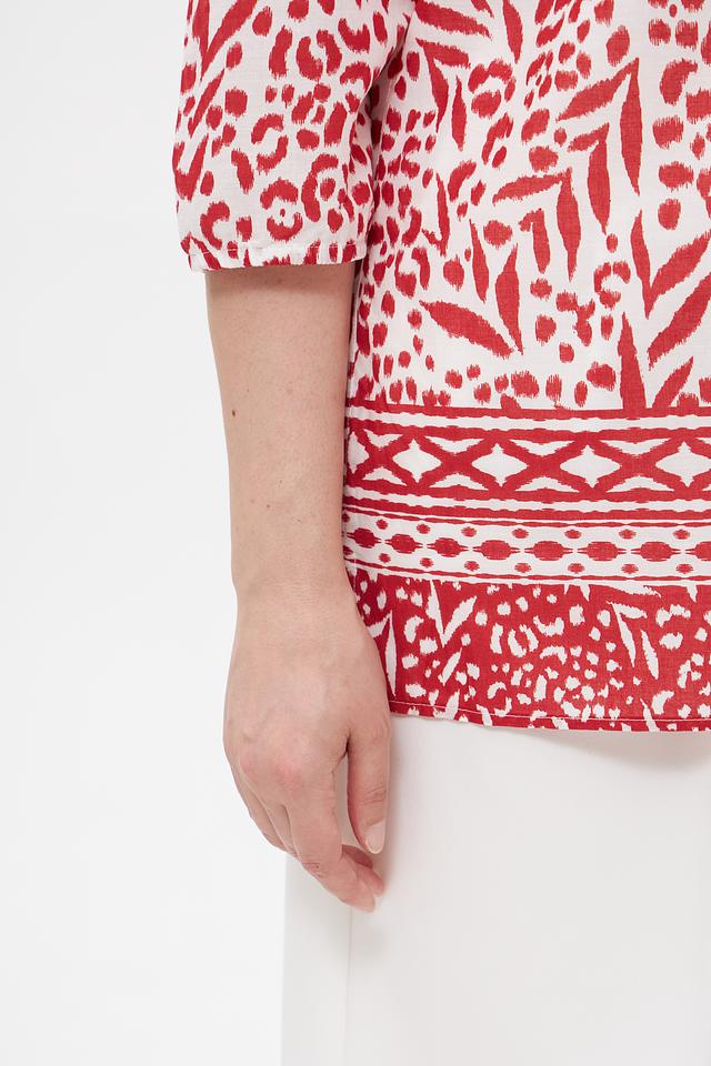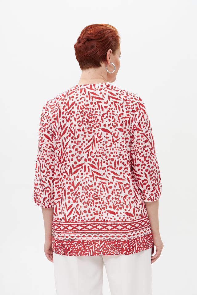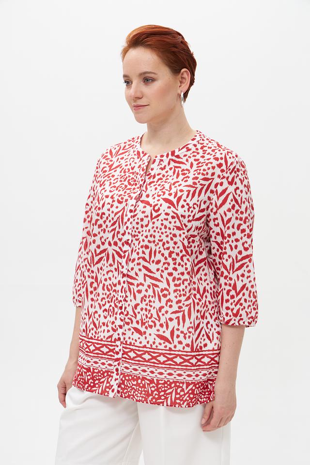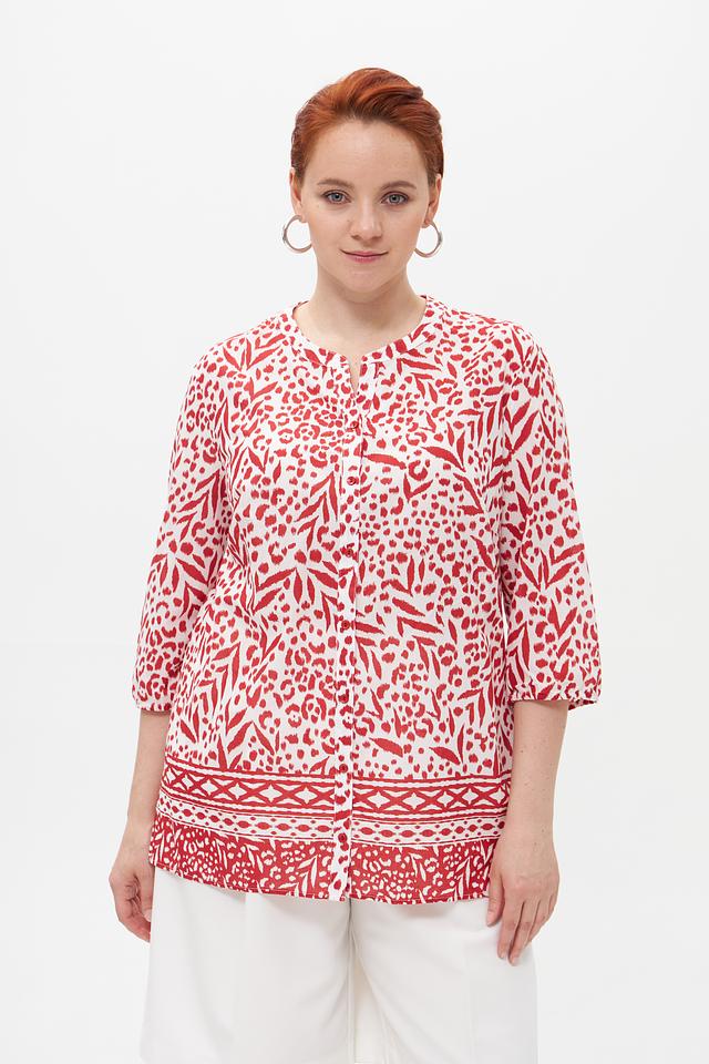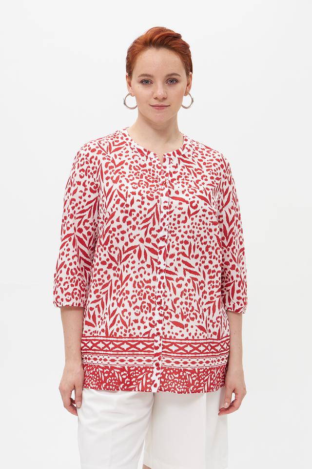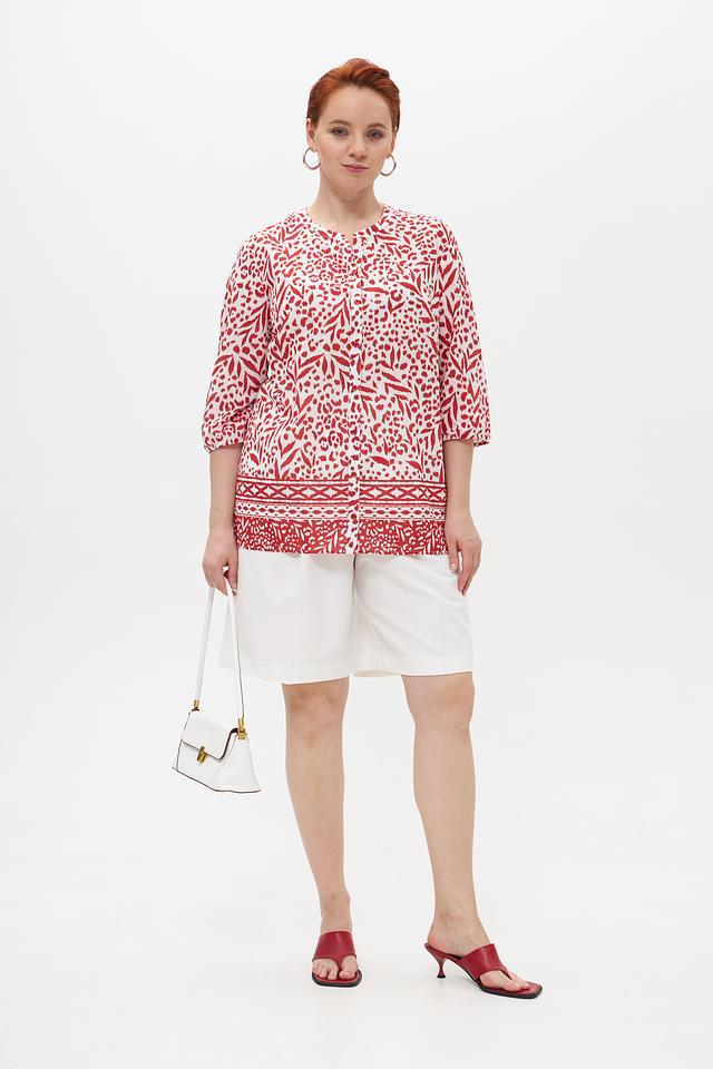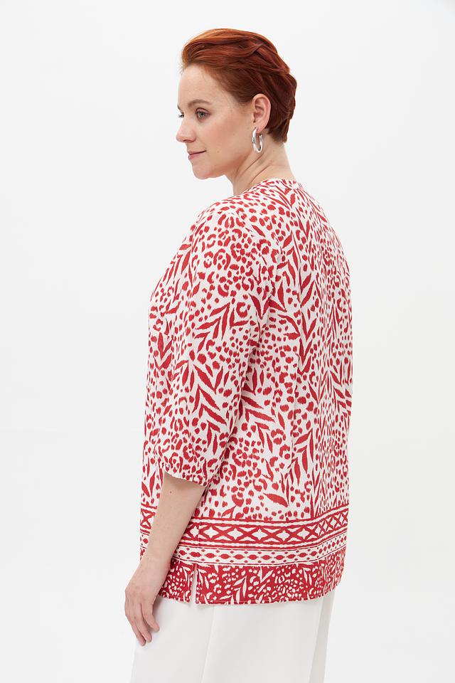 Особое внимание привлекает яркий принт с цветочным и геометрическим орнаментом в красных тонах на белом фоне. Эта блузка идеально подойдет для создания как повседневных, так и более нарядных образов. Она легко сочетается с брюками, юбками и джинсами.