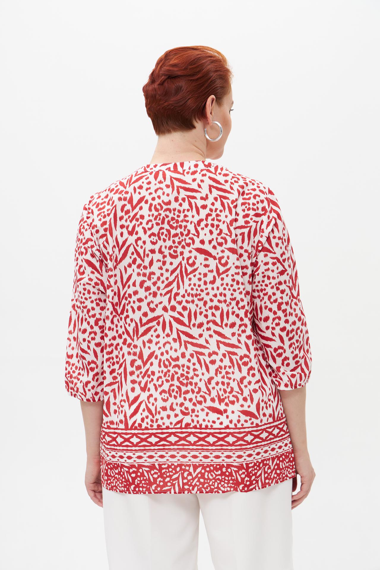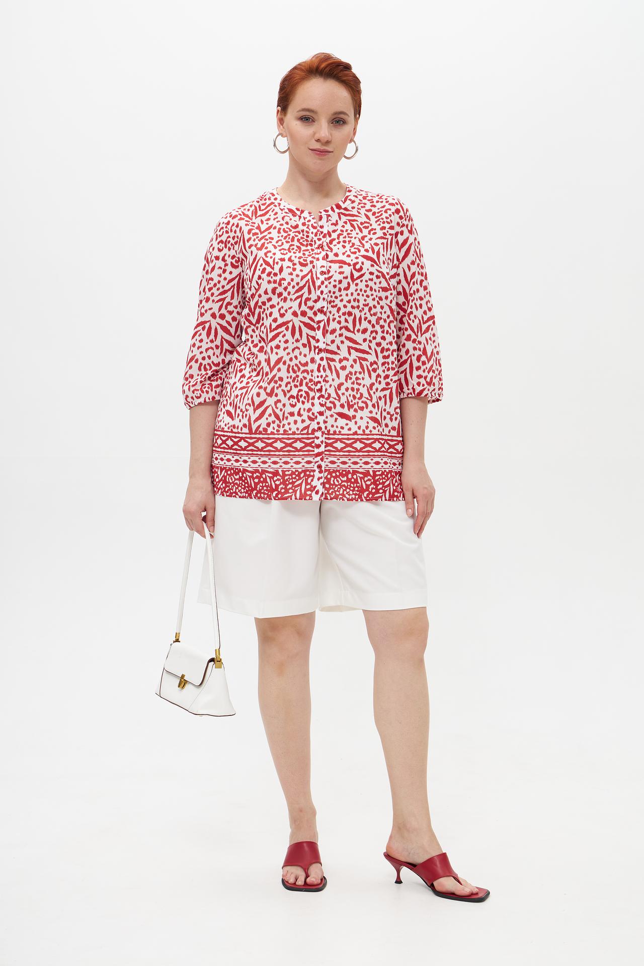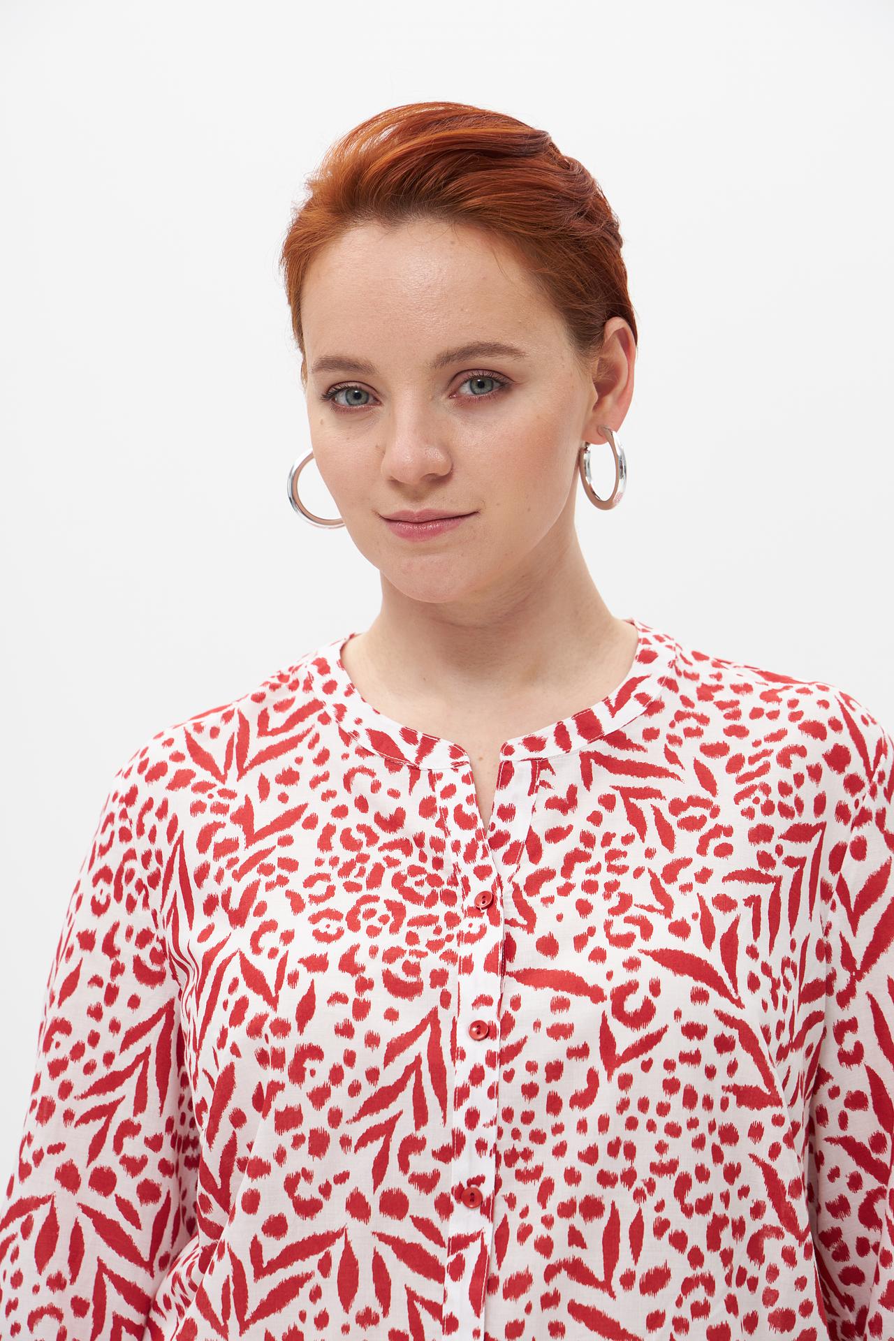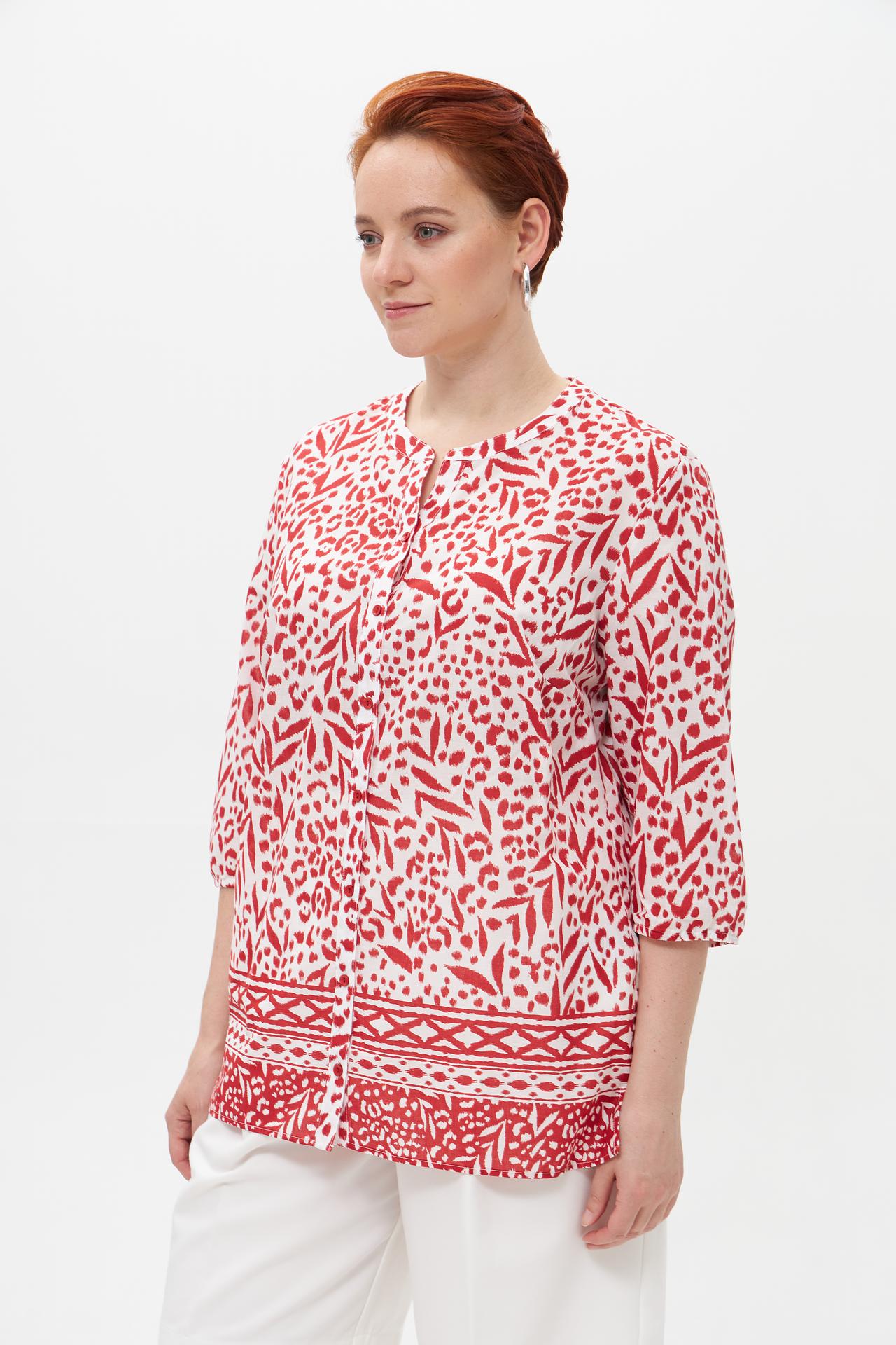 Женская блуза Lebek, выполненная из 100% натурального хлопка, станет идеальным выбором для комфортного и стильного летнего образа. Яркий красно-белый принт, сочетающий анималистические и растительные мотивы, придает изделию динамичность и свежесть. Аккуратная круглая горловина без воротника и планка на пуговицах до середины груди завершают классический дизайн.