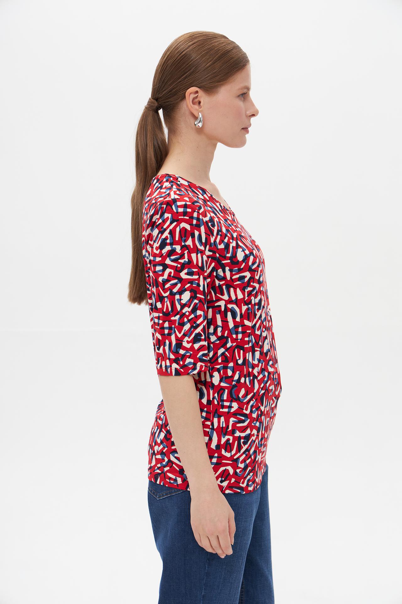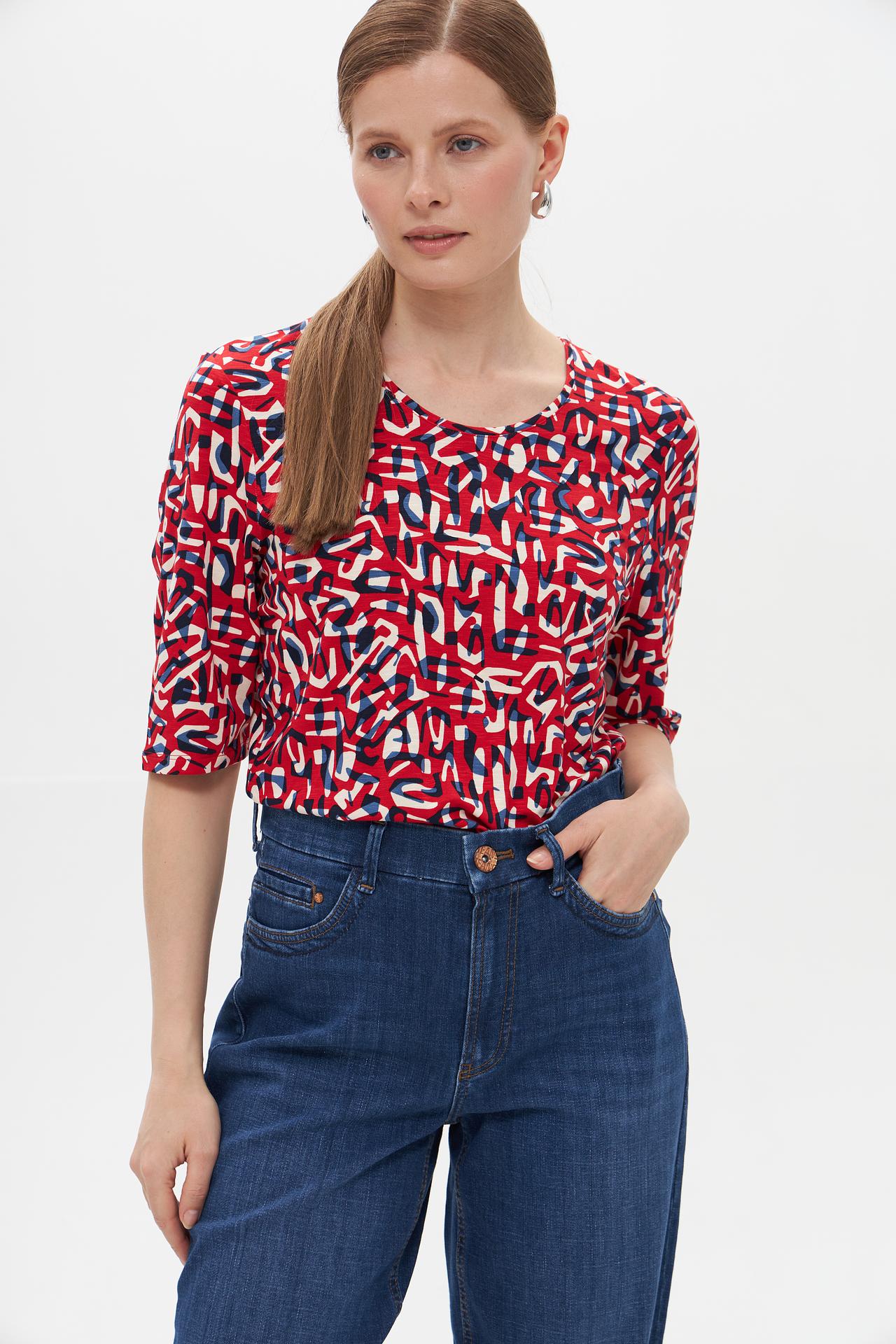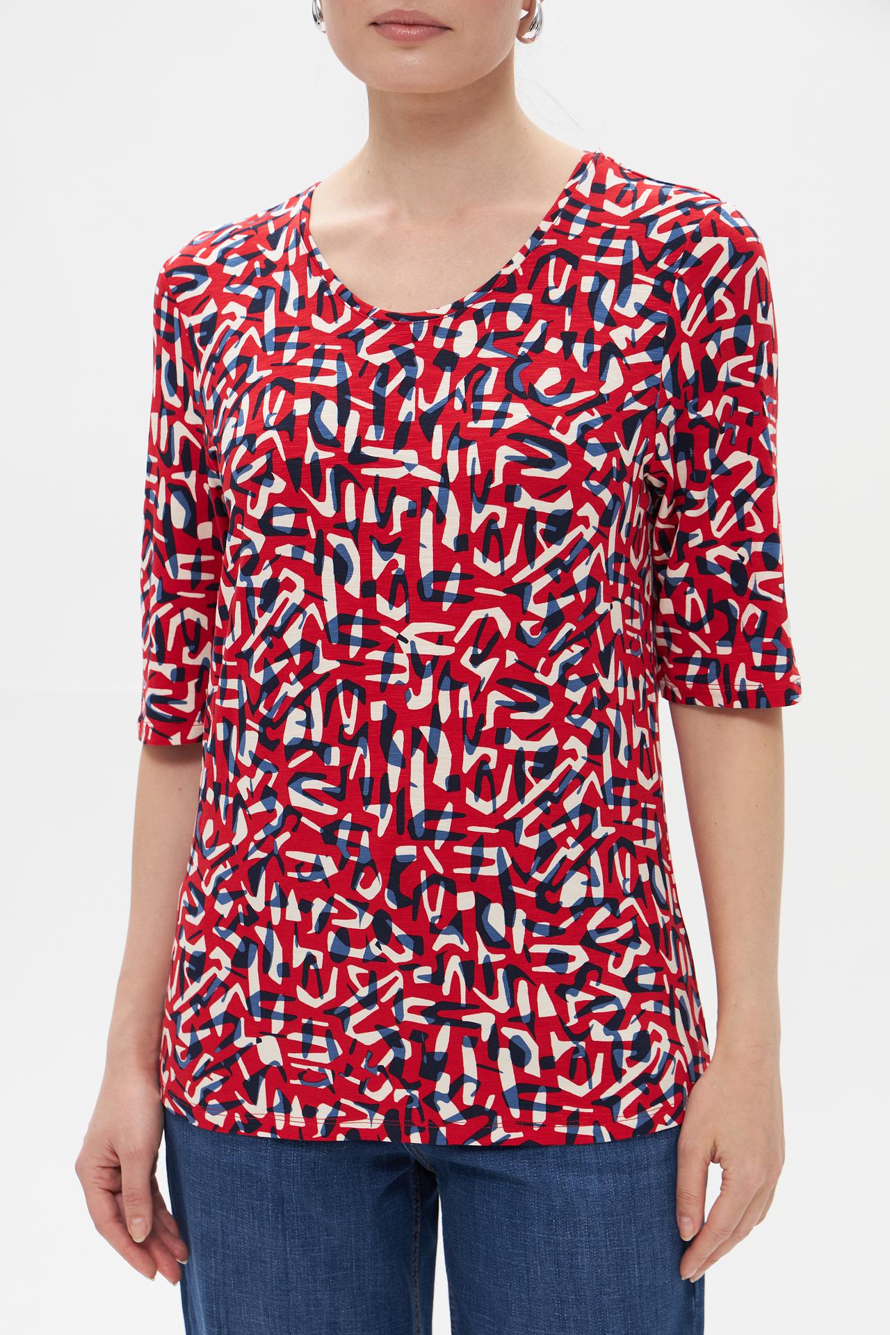 - Дизайн: Оригинальный абстрактный принт в красно-сине-белой гамме привлекает внимание и добавляет индивидуальности.