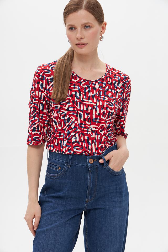 Футболка имеет прямой крой и короткий рукав, что делает ее универсальной для различных случаев. Главная особенность модели – эффектный абстрактный принт в красных, белых и синих тонах, который придаёт ей индивидуальность.