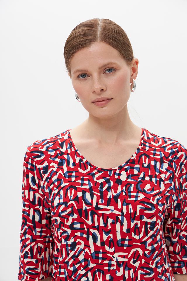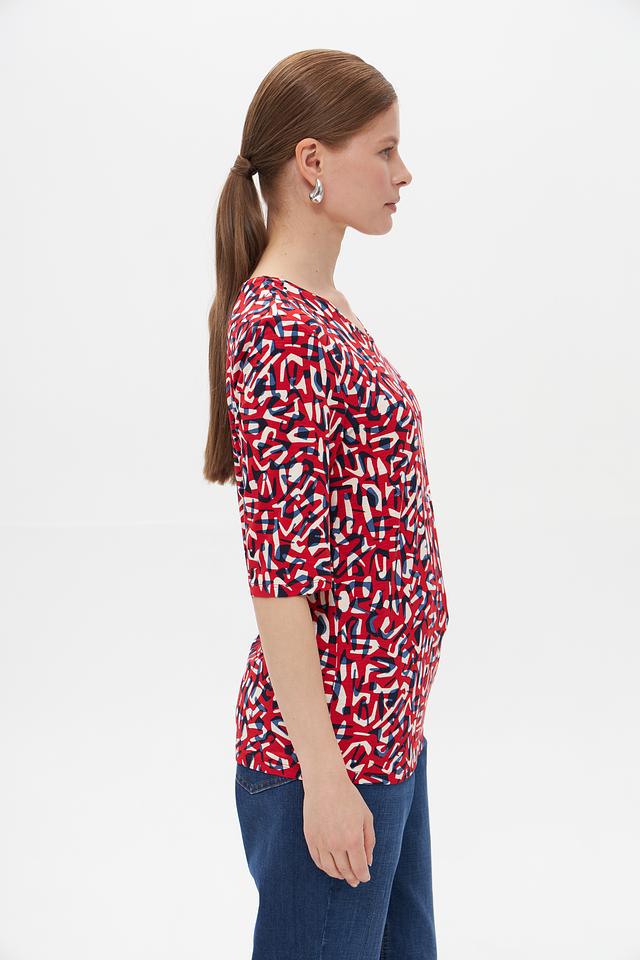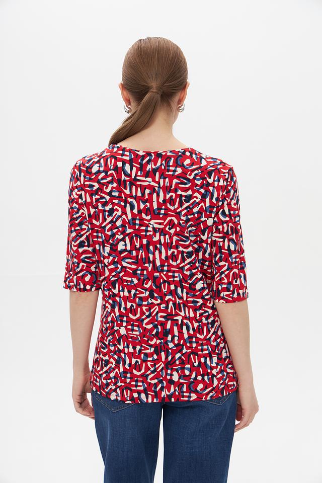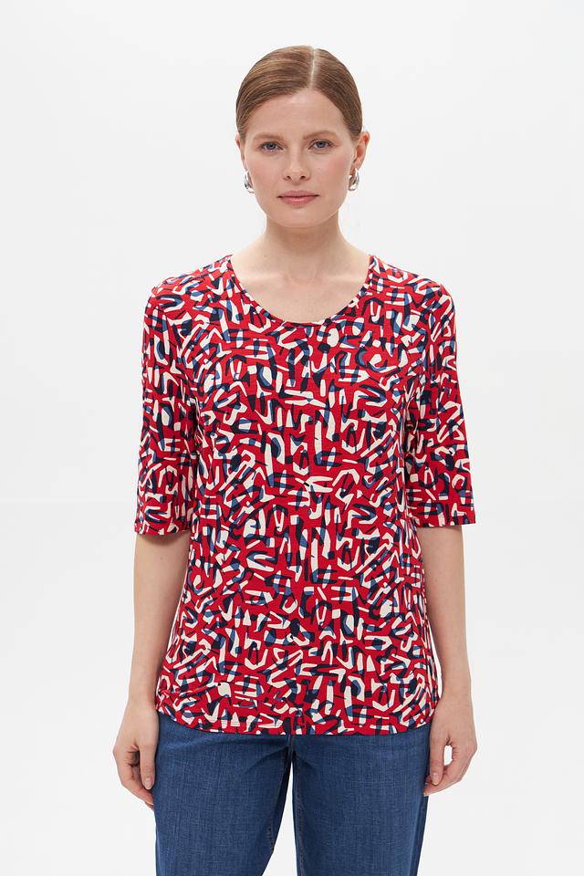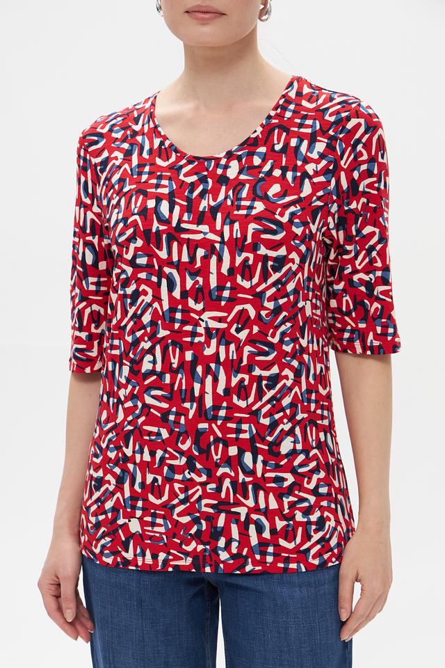 Женская футболка Lebek красного цвета с оригинальным абстрактным принтом. Модель выполнена из мягкой вискозы с добавлением эластана, обеспечивающего комфортную посадку по фигуре. Состав: вискоза 96%, эластан 4%