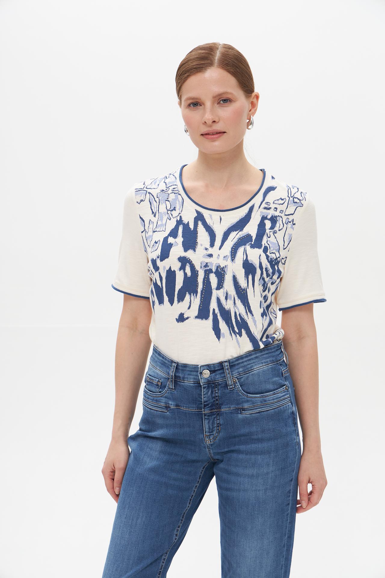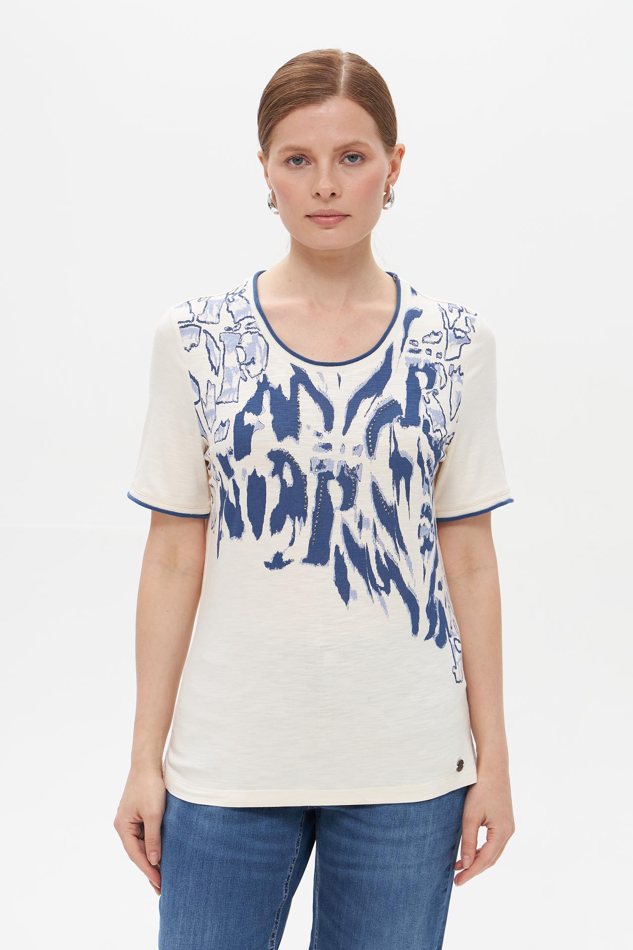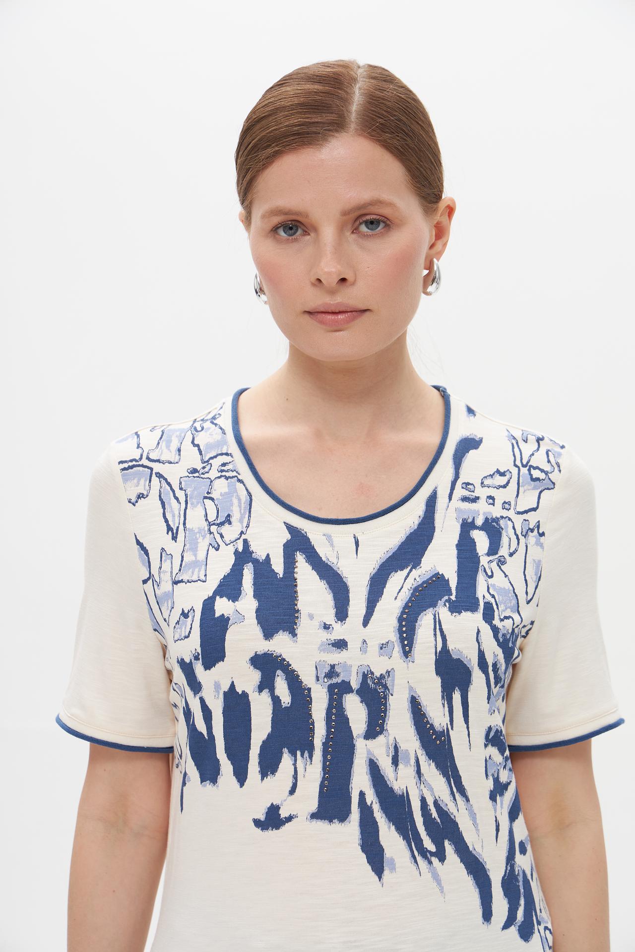 Изысканная женская футболка от Lebek, выполненная из мягкой и приятной на ощупь ткани (95% вискоза, 5% эластан). Эта футболка станет прекрасным дополнением к вашему гардеробу благодаря своему стильному дизайну и комфортной посадке. Оригинальный принт в синих тонах придает модели неповторимый шарм и делает ее отличным выбором для создания модных образов.