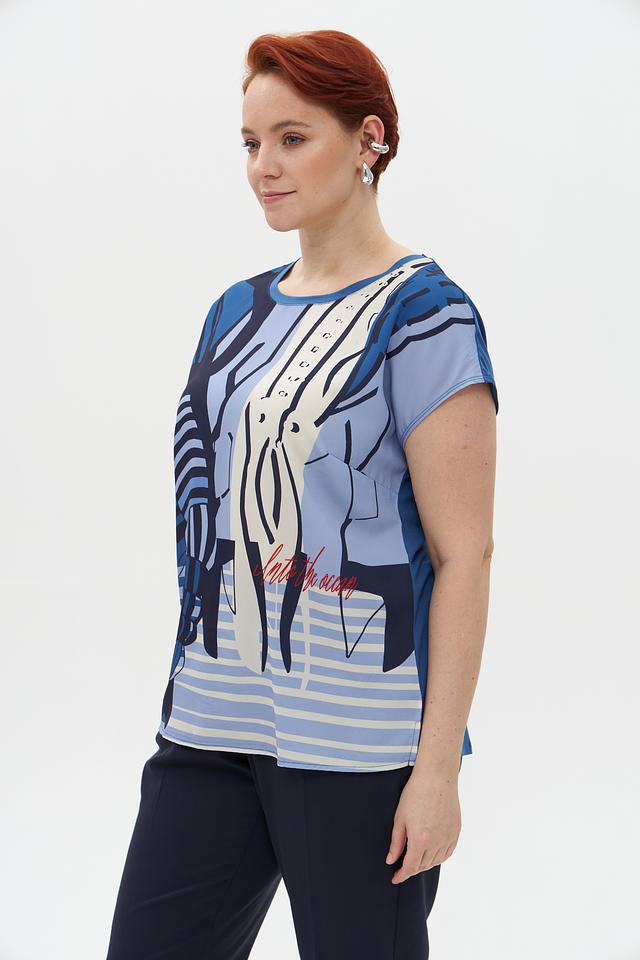 Блузка имеет свободный крой, короткие рукава и округлый вырез горловины. Главная особенность – эффектный принт с изображением креветок в сочетании полосок и абстрактных элементов. Цветовая гамма включает оттенки голубого, белого и синего.