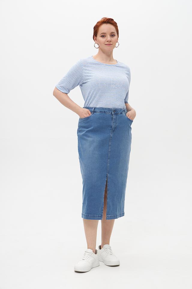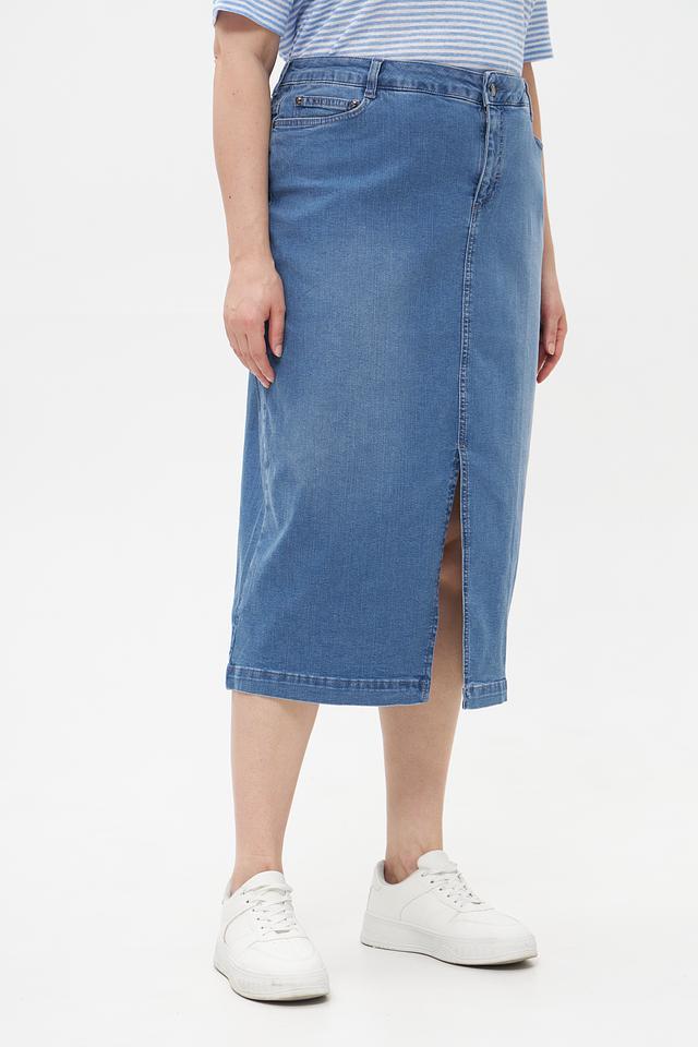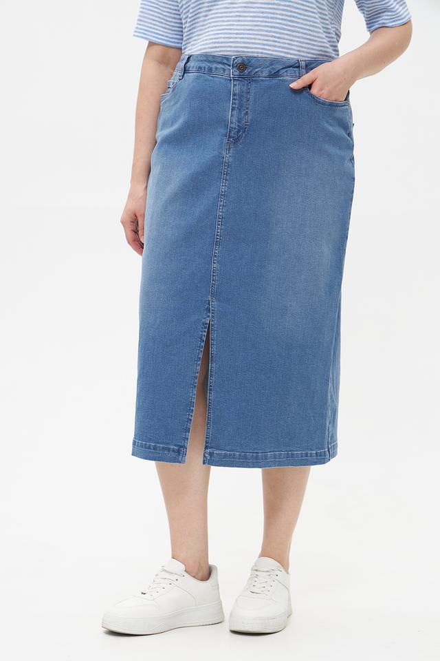 Джинсовая юбка Lebek голубого цвета, средней длины и с разрезом спереди. Изготовлена из хлопка с добавлением эластана для комфорта и свободы движений. Состав: хлопок 97%, эластан 3%