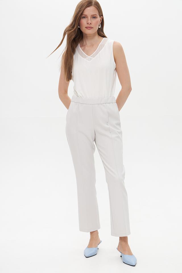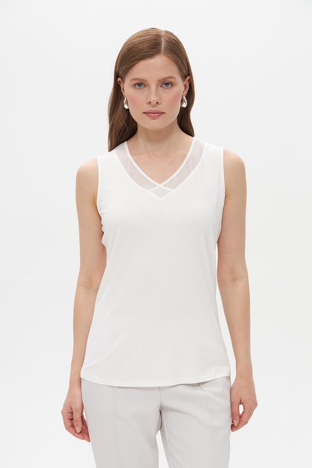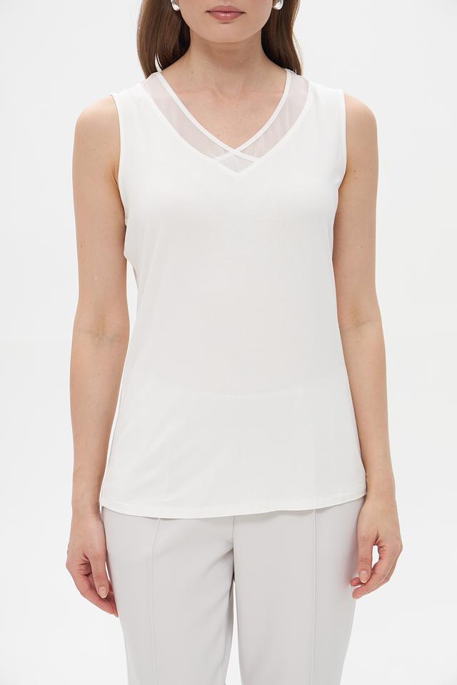 Топ имеет классический крой с V-образным вырезом, который подчеркивает линию шеи и декольте. Оригинальную деталь добавляет сетчатая вставка в области груди, придающая изделию легкость и воздушность.