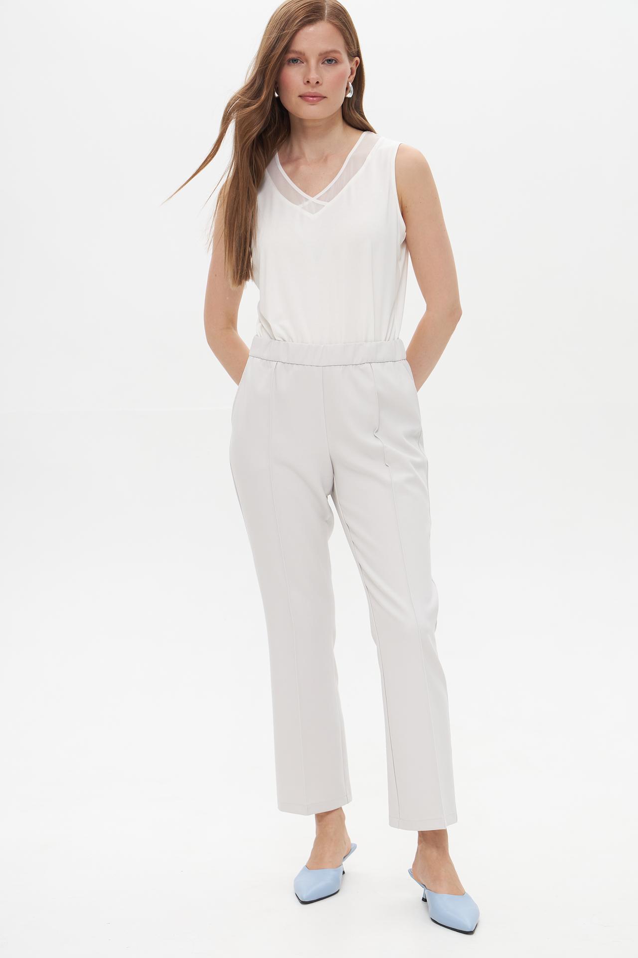 Особое внимание привлекает V-образный вырез с деликатной сетчатой вставкой, добавляющей образу женственности и изысканности. Топ легко сочетается с различными элементами одежды, создавая неповторимый и стильный образ.
