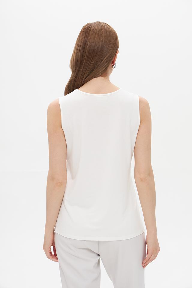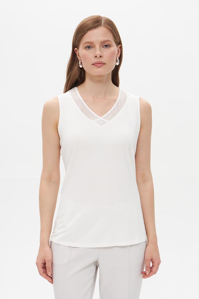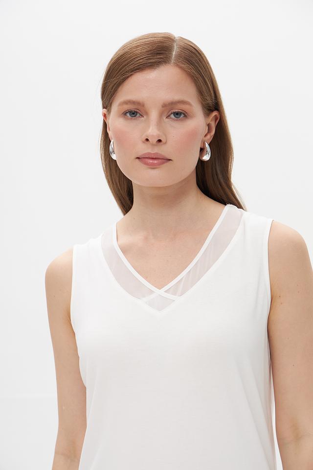 Белый топ от Lebek с V-образным вырезом и сетчатой вставкой. Изготовлен из вискозы с добавлением эластана для комфорта и лучшей посадки. Состав: вискоза 95%, эластан 5%