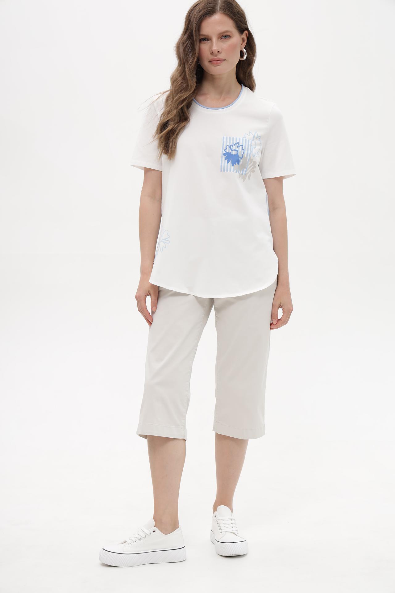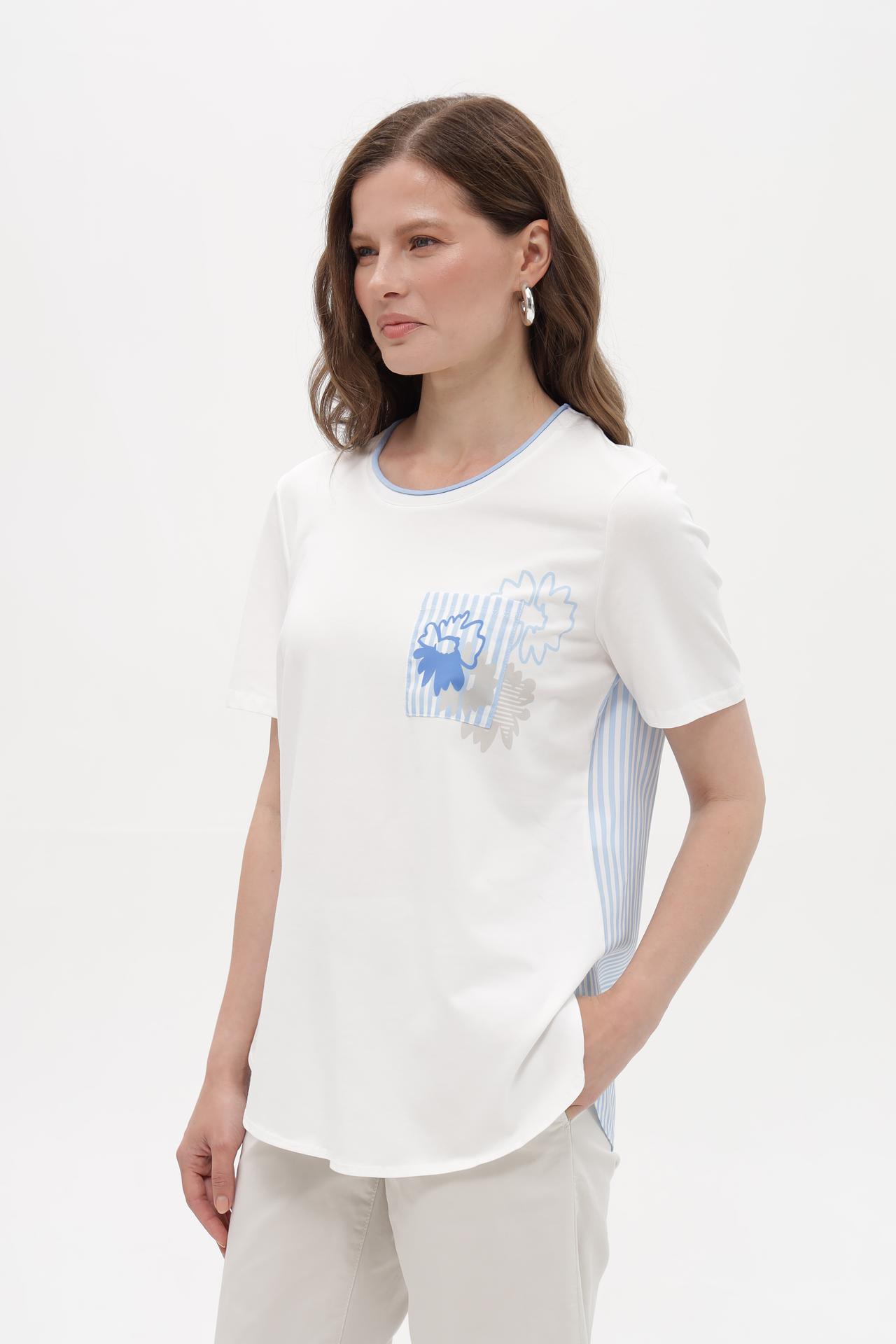 Модель выполнена в классическом белом цвете, который легко сочетается с любыми предметами гардероба. Оригинальный принт в виде цветов на нагрудном кармане и небольшой принт на боковом шве добавляют блузе женственности и очарования. Декоративная голубая окантовка по горловине придает изделию завершенный вид.