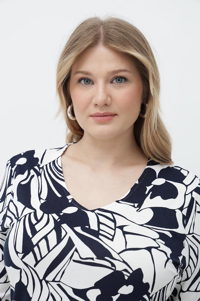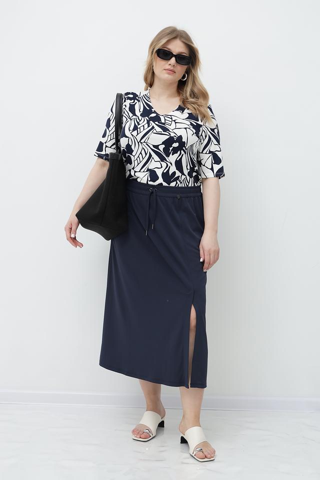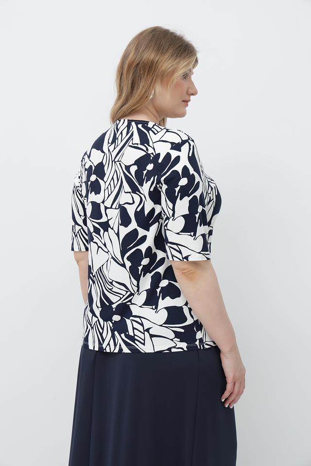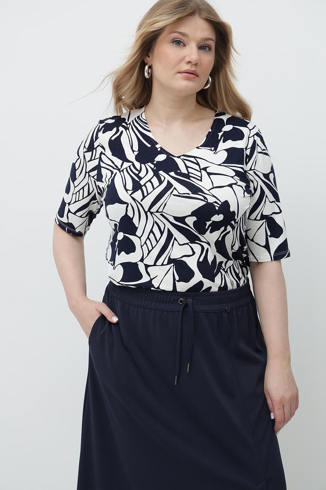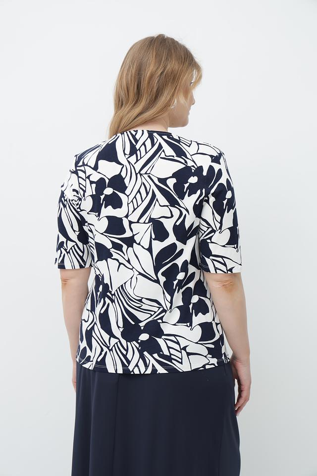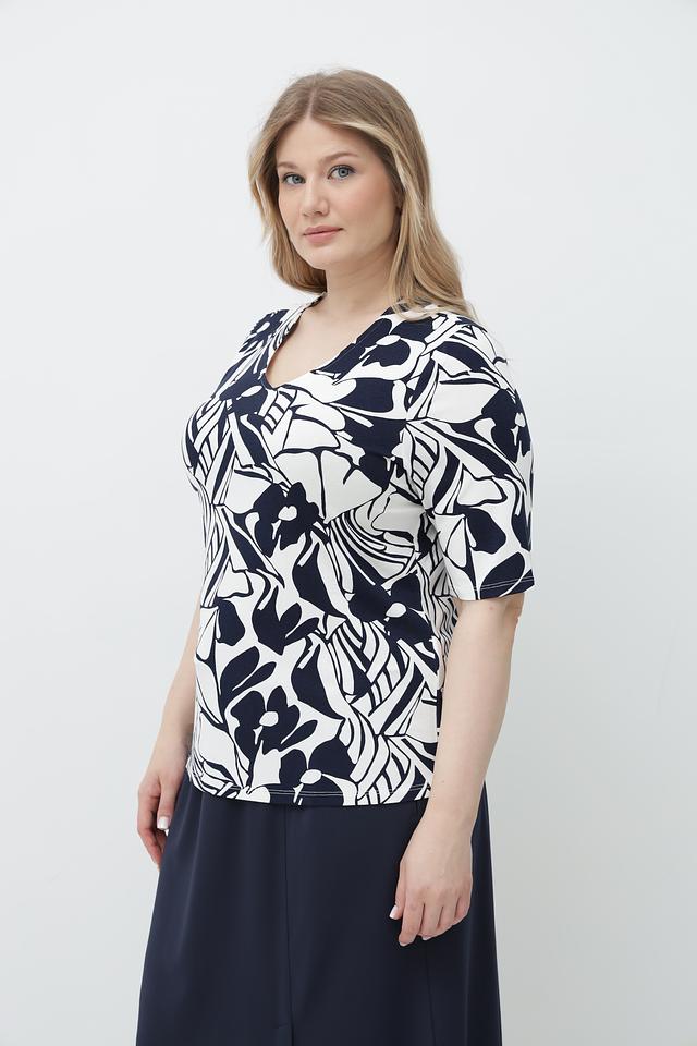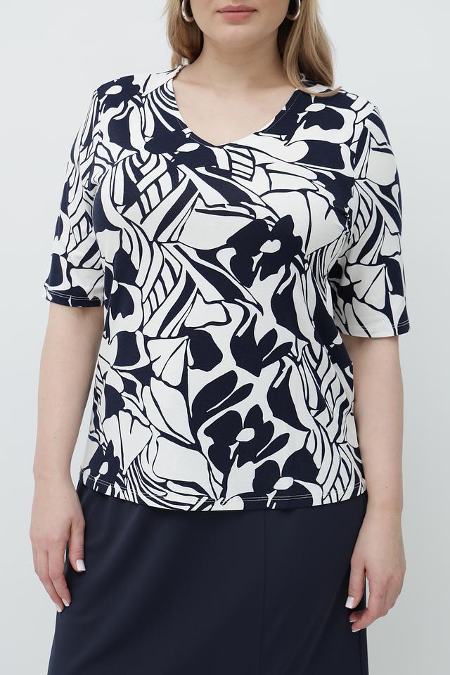 Футболка имеет прямой крой и короткий рукав. Главная особенность модели – эффектный принт в сине-белых тонах, который добавляет образу оригинальности. V-образный вырез горловины подчеркивает женственность.