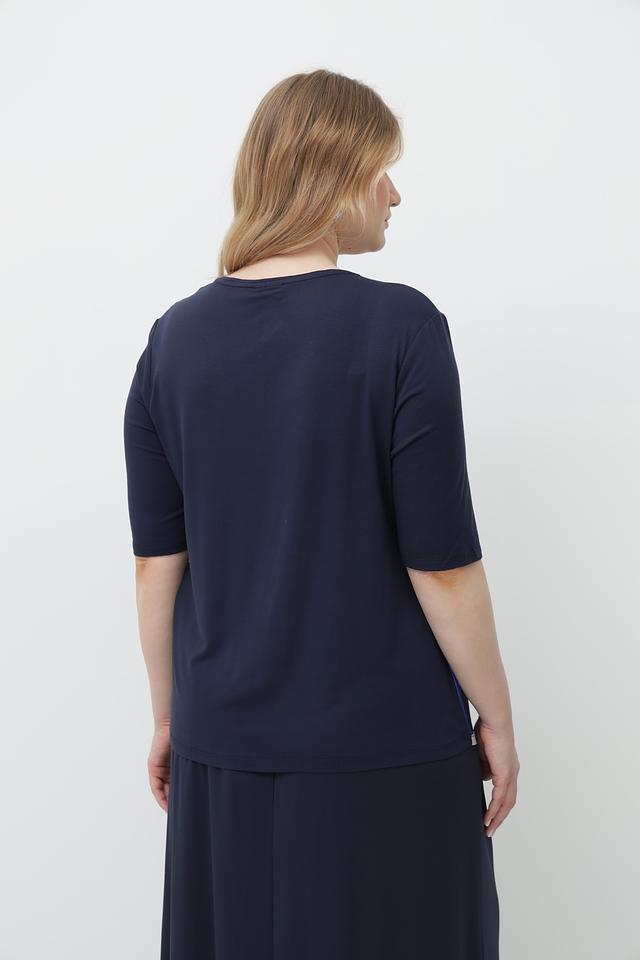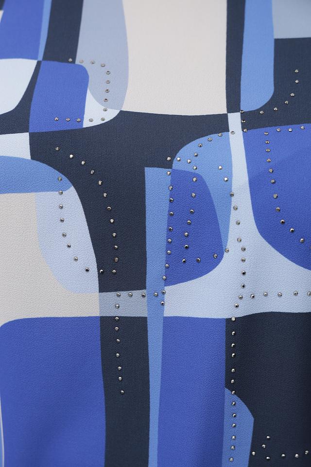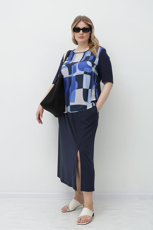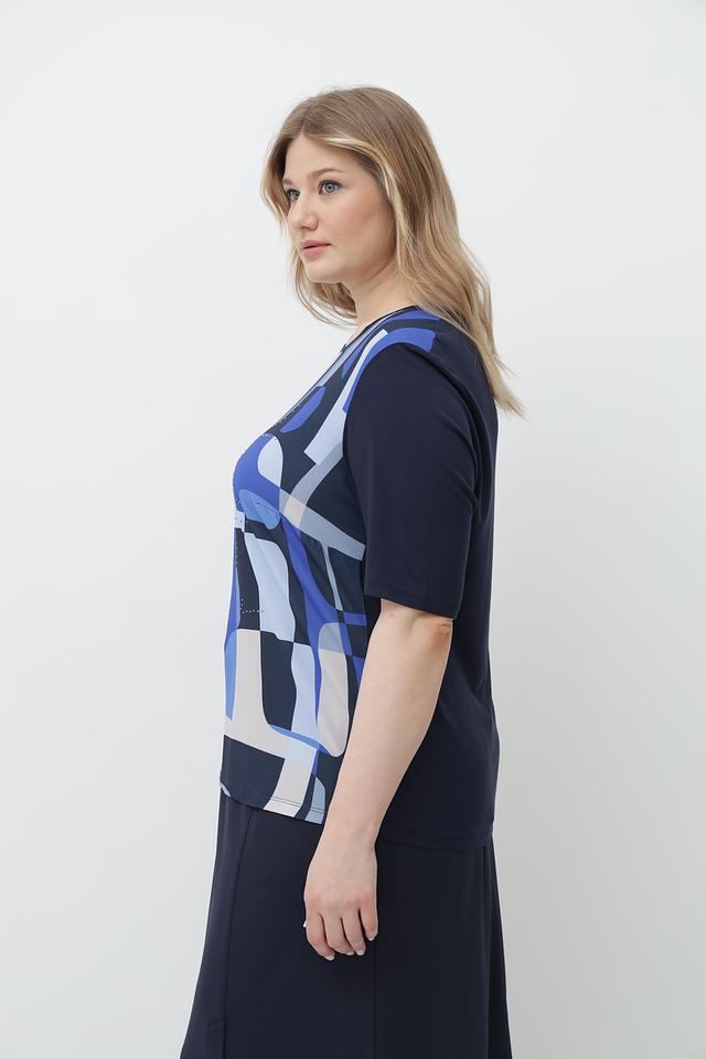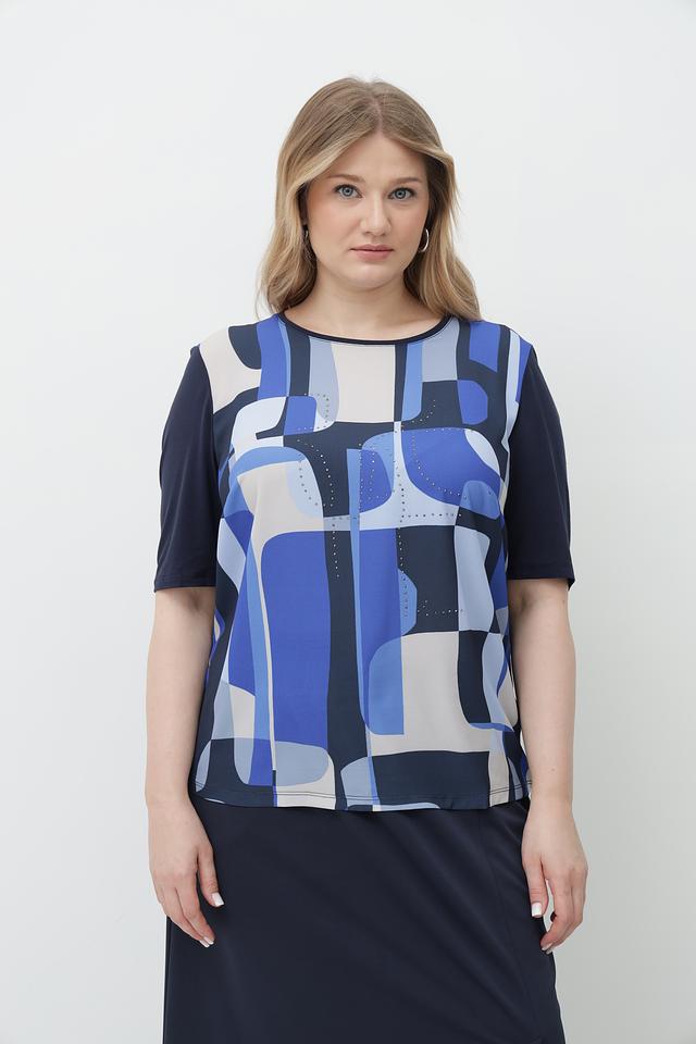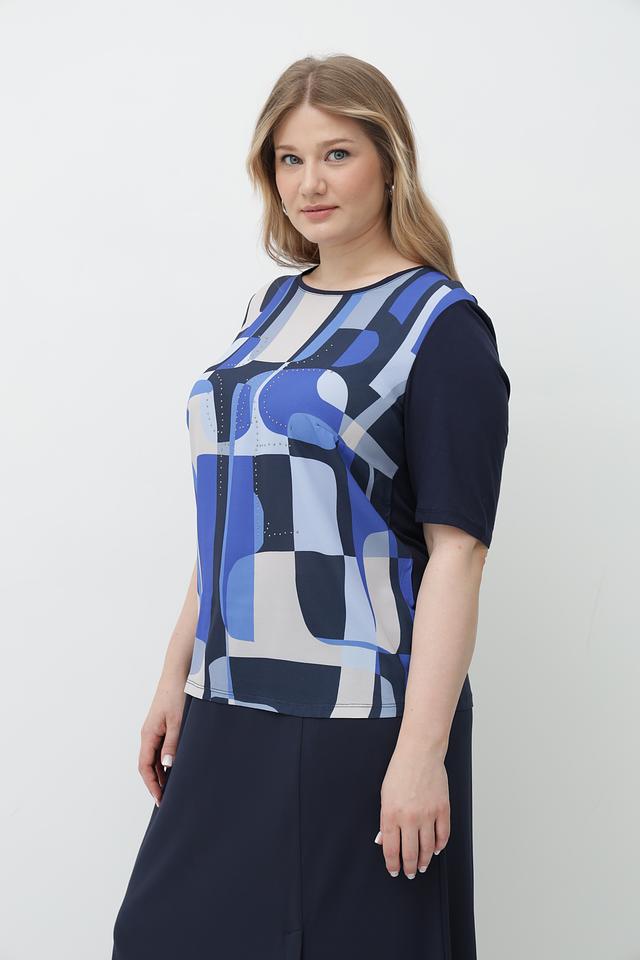 Основной цвет блузы – тёмно-синий, а её особенность – эффектный геометрический принт, выполненный в сочетании синих, голубых и белых оттенков. Круглый вырез горловины и короткие рукава делают эту модель идеальной для тёплой погоды.