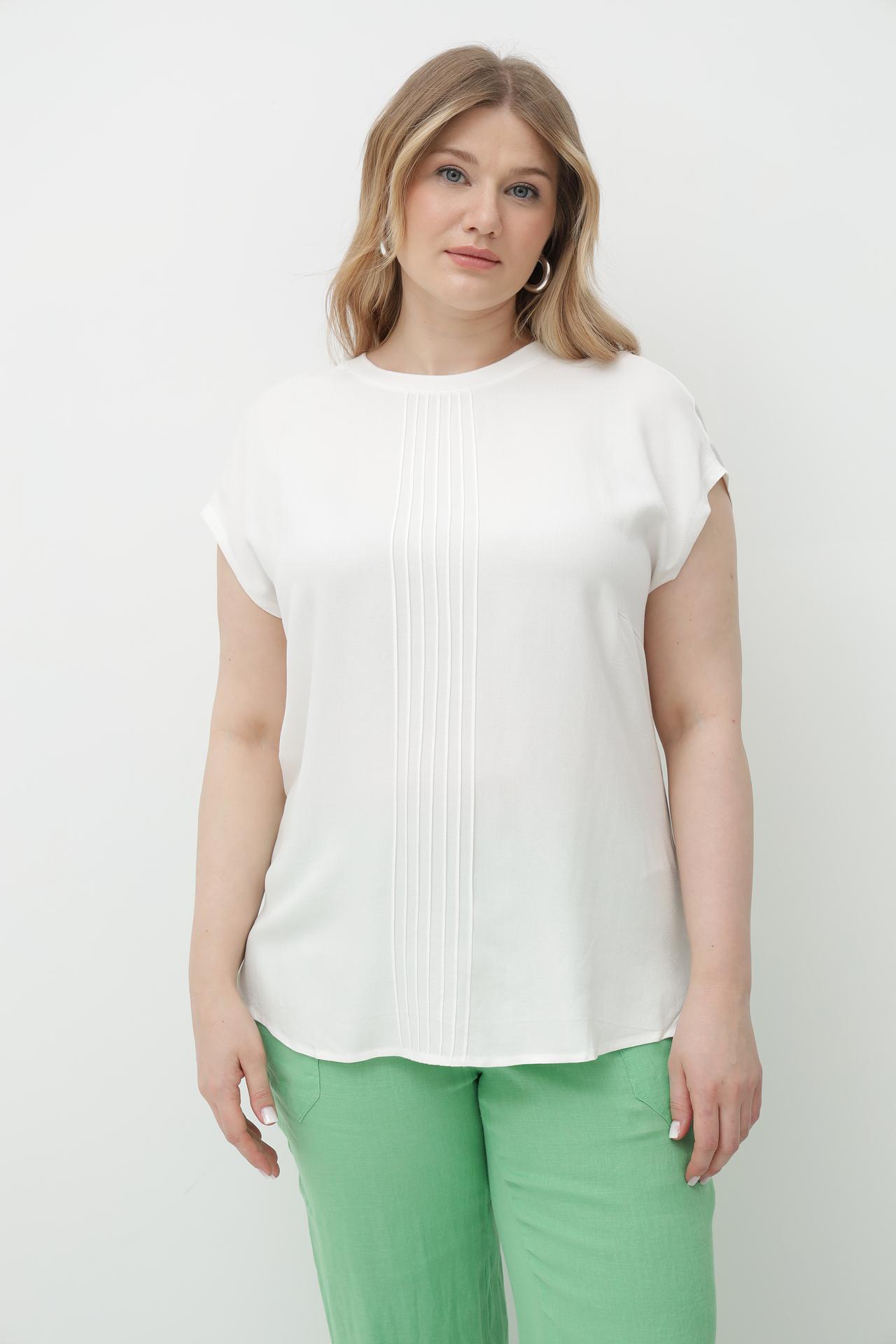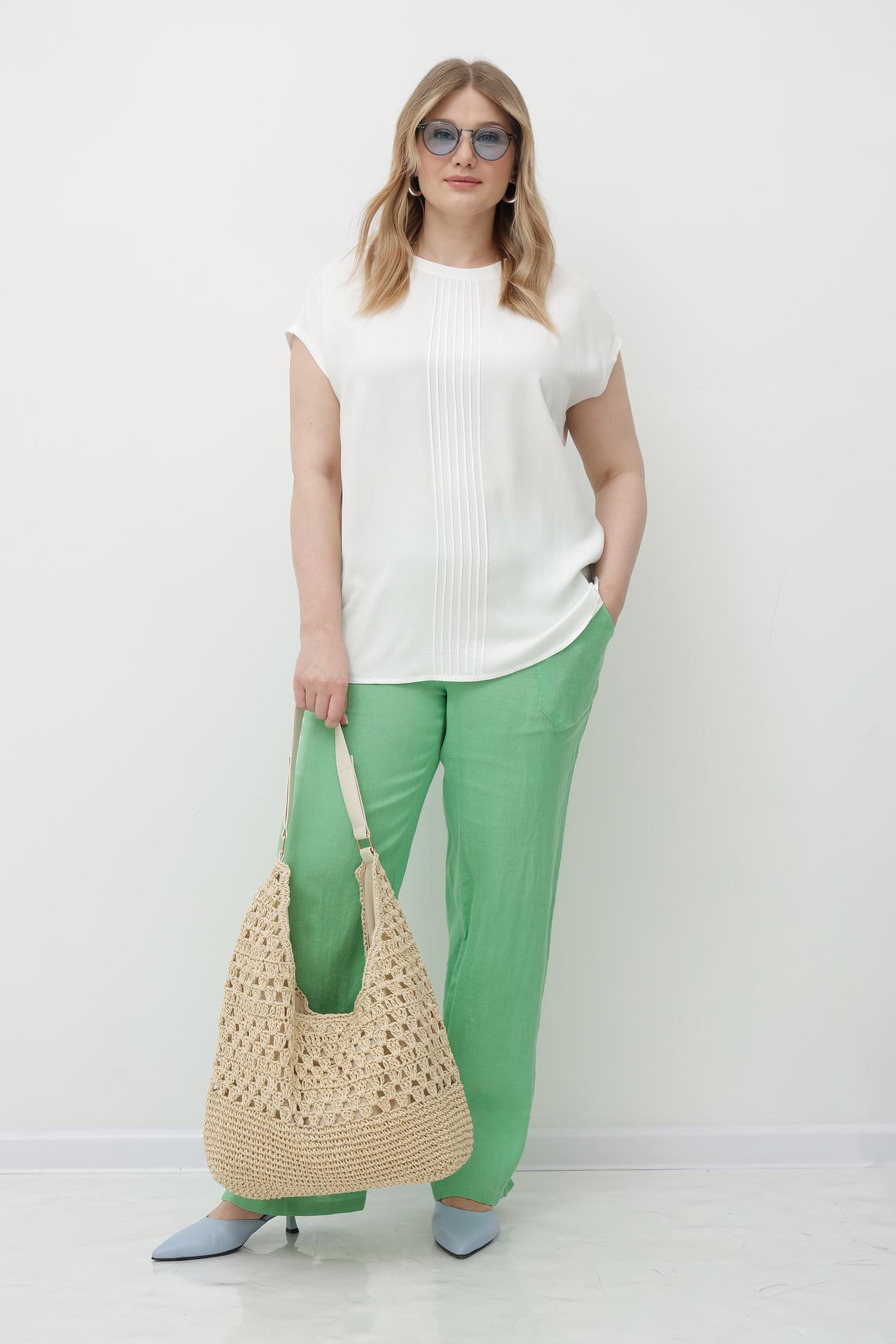 - Декоративные детали. Вертикальные складки на передней части блузы добавляют изысканности и делают образ более интересным.