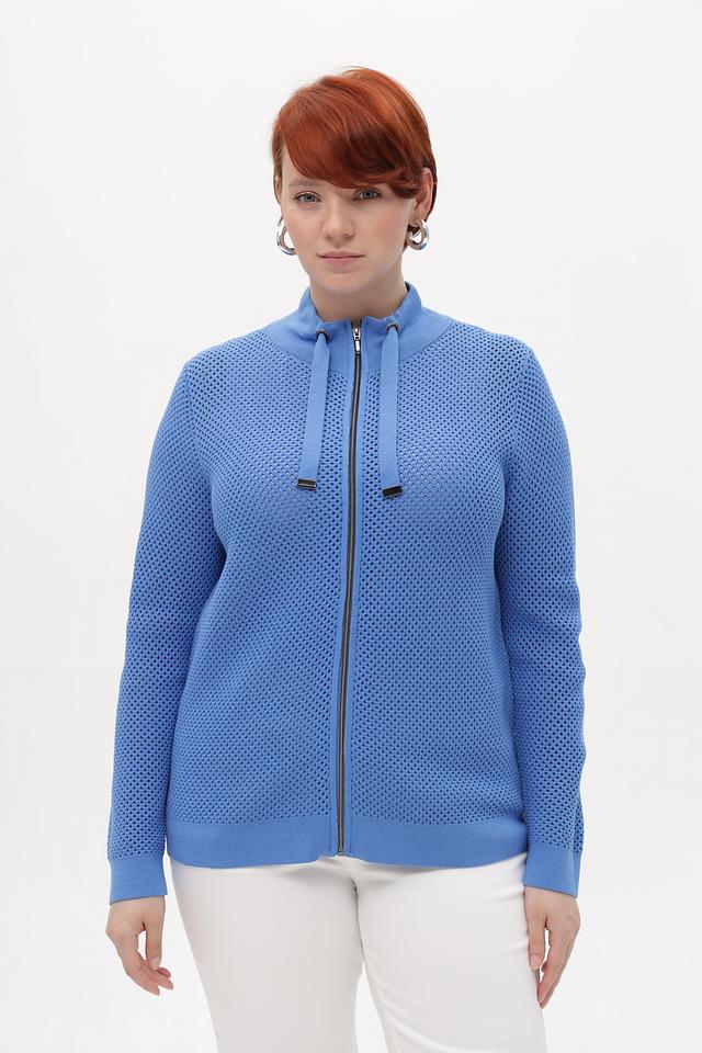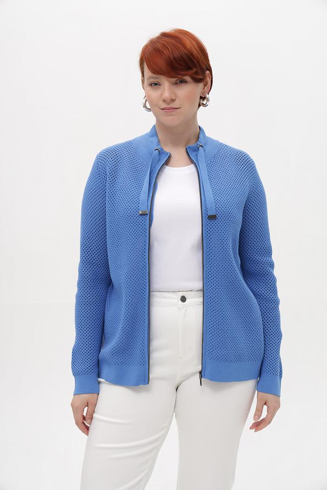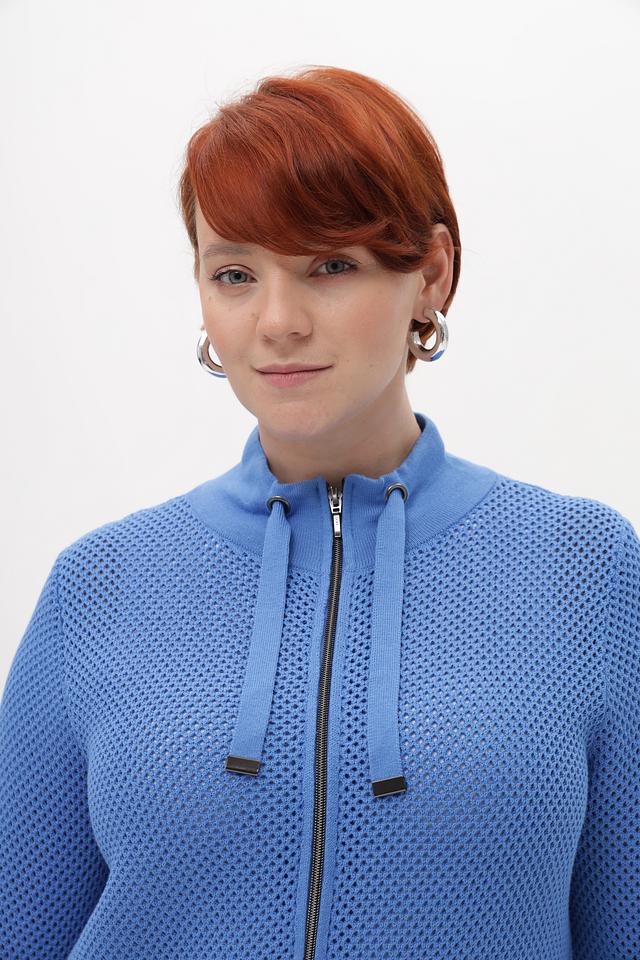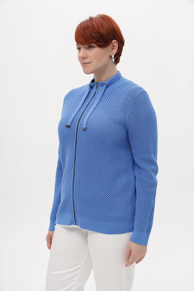 Голубой жакет от Lebek из перфорированного трикотажа на молнии. Модель выполнена из хлопка с добавлением полиакрила для мягкости и сохранения формы. Застежка – молния с двумя декоративными шнурками на воротнике. Состав: хлопок 50%, полиакрил 50%
